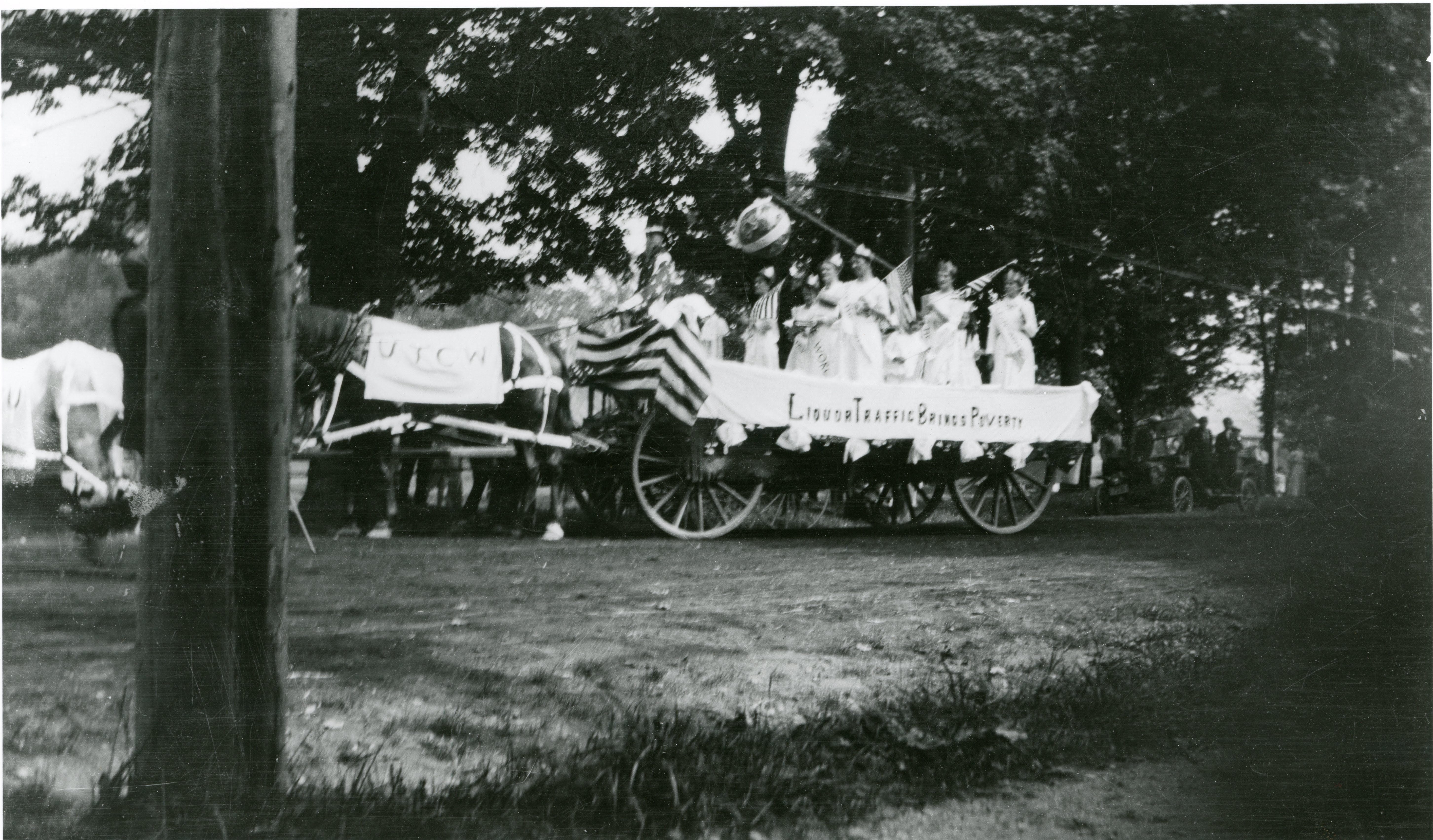 Parade floats were a common way women brought the causes of prohibition and suffrage to the community. This Norwich parade float features WCTU women dressed in white with a banner draped over the horses pulling their wagon.