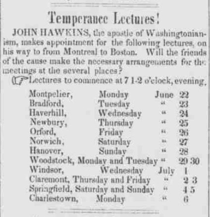 In 1846, this notice appeared in the Green Mountain Freeman, announcing that John Hawkins would be giving temperance lectures in towns as he journeyed from Montreal to Boston. Norwich was on the schedule for Saturday, June 27th at 7 p.m. He probably gave his lecture from the pulpit of the Norwich South Congregational Church next to the parade grounds of Norwich University.