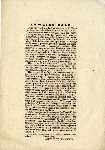 Hawkins learned a lot during his visit to Norwich. Soon after his visit, he published this card to be distributed widely. In it he accuses Norwich University President, Alden Partridge, of promoting the "habitual use of intoxicating drinks....and on the last 4th of July, he "presided at a drunken revel with his own students and others, with great apparent delight." He then "urged the more cautious to drink... the result was, as well might be expcted, that several of the Dartmouth students, and of his own pupils were most decidedly intoxicated."