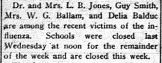 Through the whole pandemic health officer, Dr. L.B.Jones, known as the horse and buggy doctor, helped by making house calls to treat patients. He also ordered quarantines and signed death certificates.