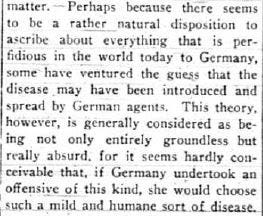 The war played a big role in the story of the pandemic. In Vermont, and around the U.S, many of the doctors and nurses had joined the army and were helping the troops overseas. Medical students and retired nurses had to step up and help. The war also made nationalist politics and blame a part of the pandemic, as shown below in a Hanover Gazette article from Oct. 3, 1918.
