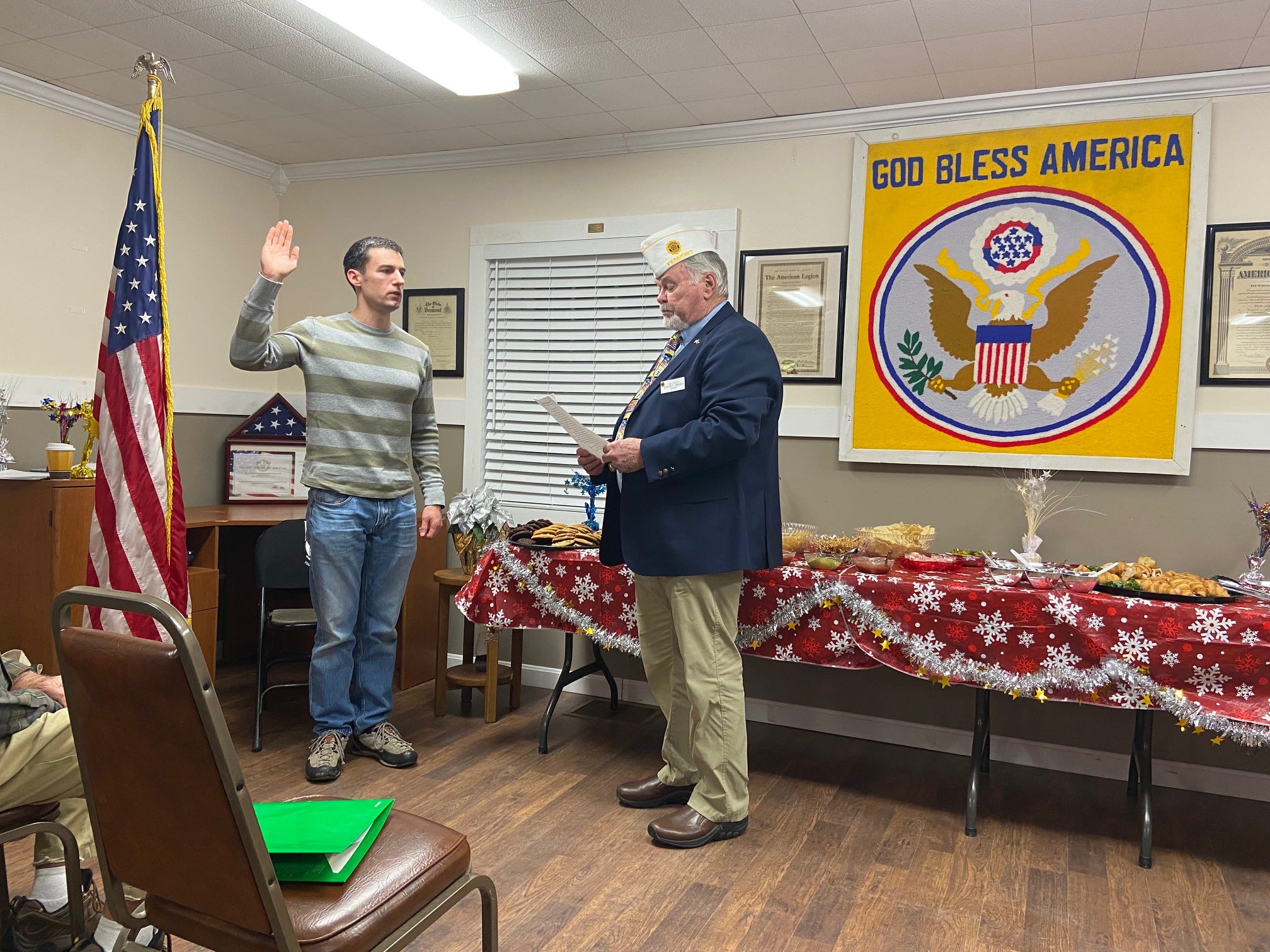 Vincent W Archer, Post # 8’s newest member is being sworn in by the State of Vermont Department Commander Tom Scanlon.