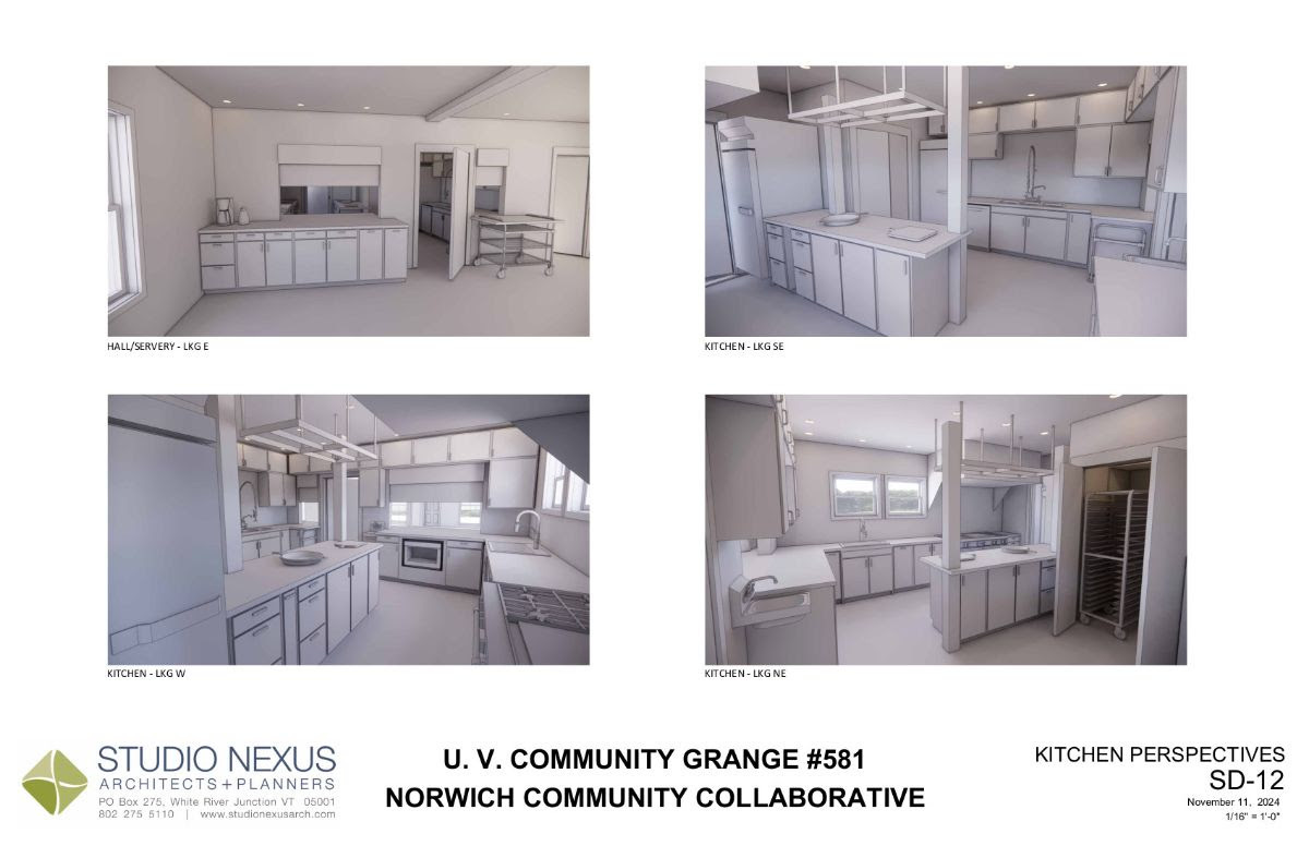 The Norwich Grange Kitchen committee has been working over the past year to bring the vision of the Community Kitchen to life. The committee has been working to assist with design and development and to define operations of the Community Kitchen. In the early months we sought input from a wide range of sources to educate ourselves about community kitchens. We went to visit seven different community/commercial kitchens to get input on design, functioning, policies, “must haves” and any other wisdom we could glean from those with experience running the kitchens. We had meetings with professionals from King Arthur Baking Company and the Co-op food stores, and met with the health inspector to better understand regulations and requirements that allow a kitchen to be designated commercial. All these conversations helped inform the committee to work with Studio Nexus on the design and flow of the kitchen. We are very excited about what we have planned for the space.