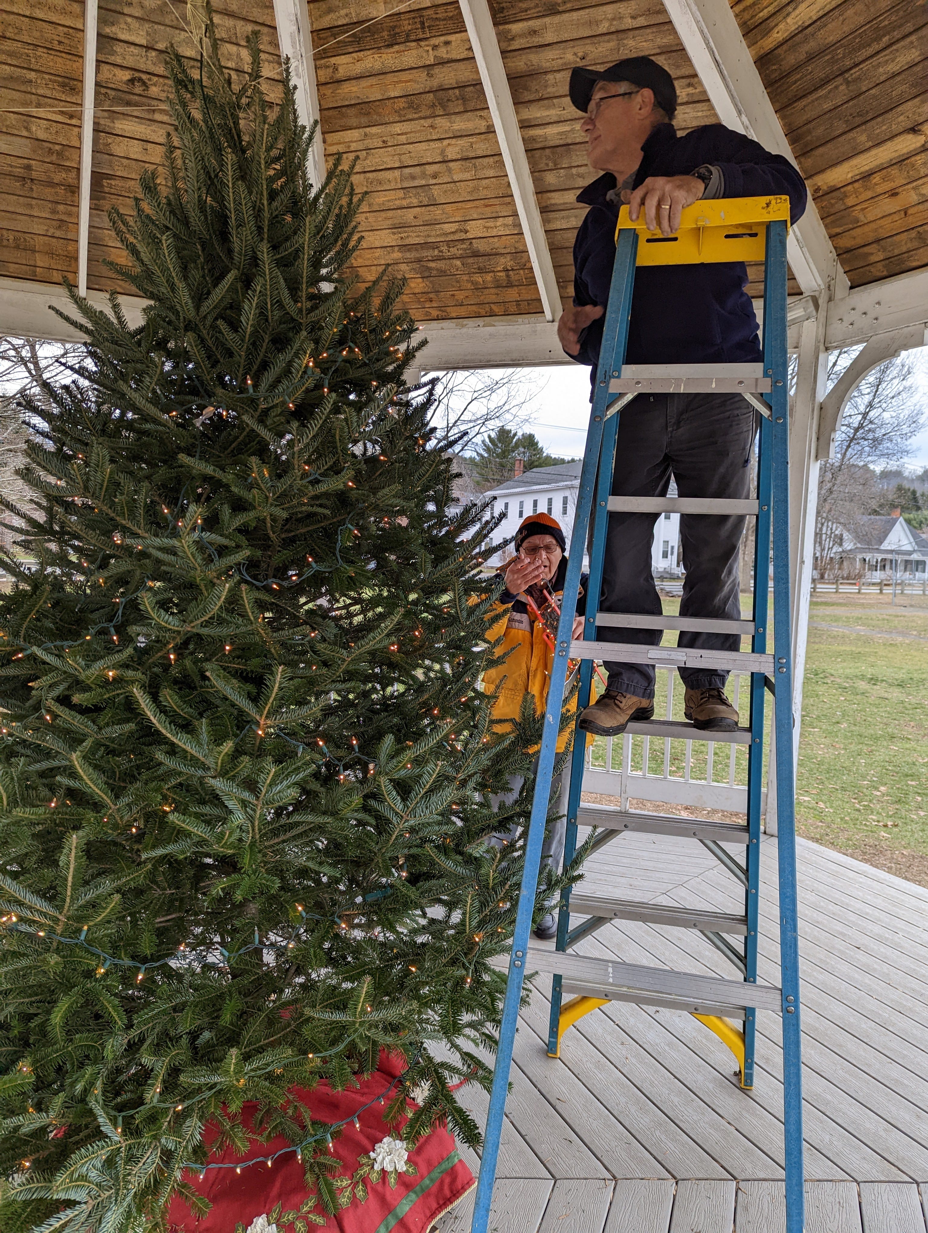 Glenn Britton and Gary De Gasta gave over 4 hours out of their day today to go to the Nichols Tree Farm in Lyme, pick out the right tree, chop it down and bring it back to Norwich. It actually took almost another two hours just to get the tree in the stand and align it just right. Next came the lights and then the remaining decorations. They decided to go ahead and let people enjoy the lights on the tree since the lights strung along the fence on Main Street were already up and operating. The tree was noticed right away by people passing by who were very complimentary.