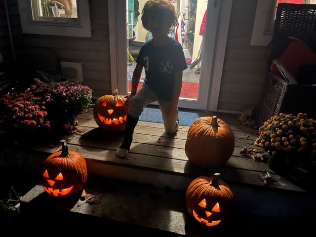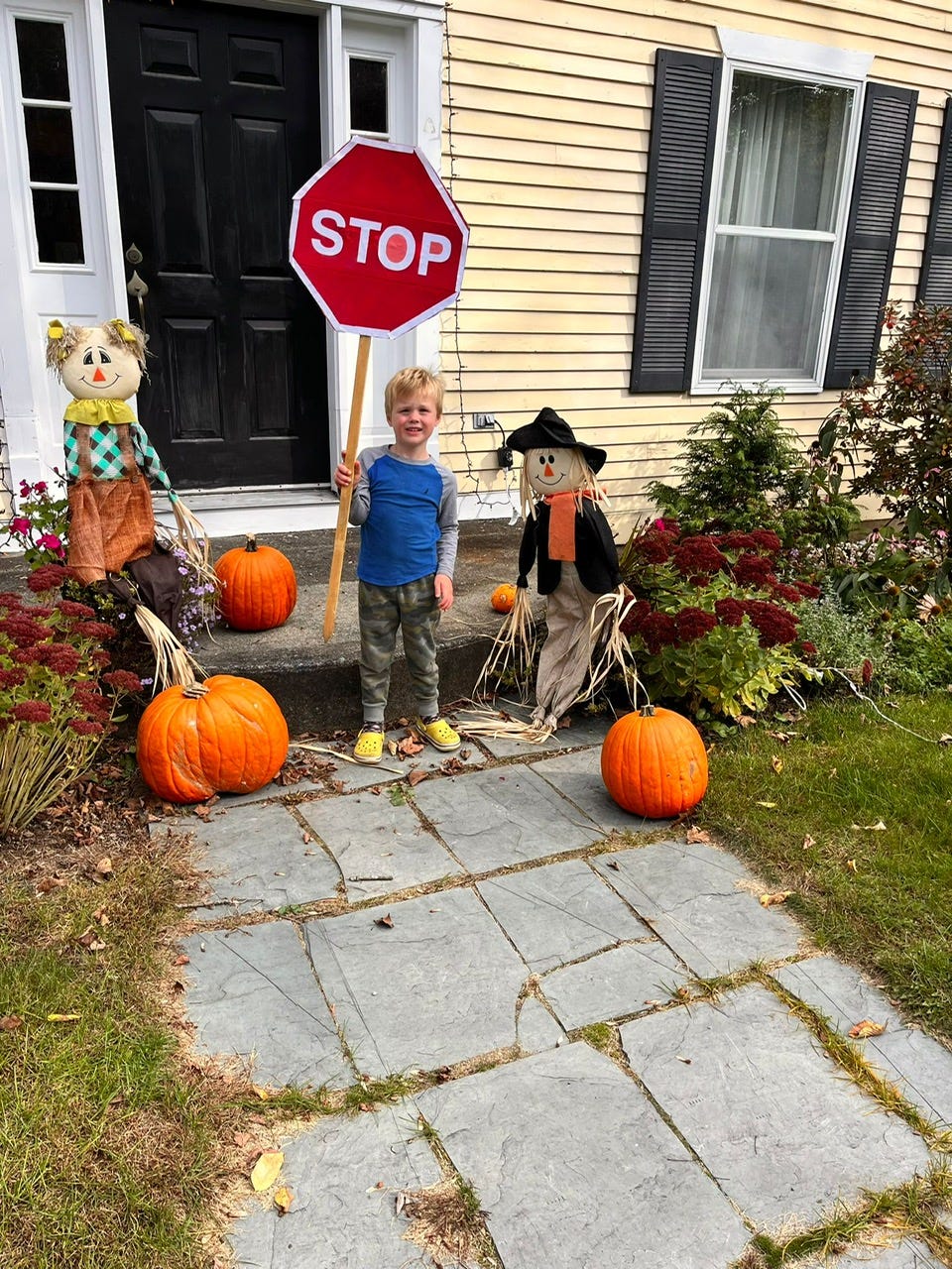 Stop! It’s time to trick or treat! Most of these pumpkins came from just one plant in the backyard, says the owner, and this stop sign was handmade by this youngster.