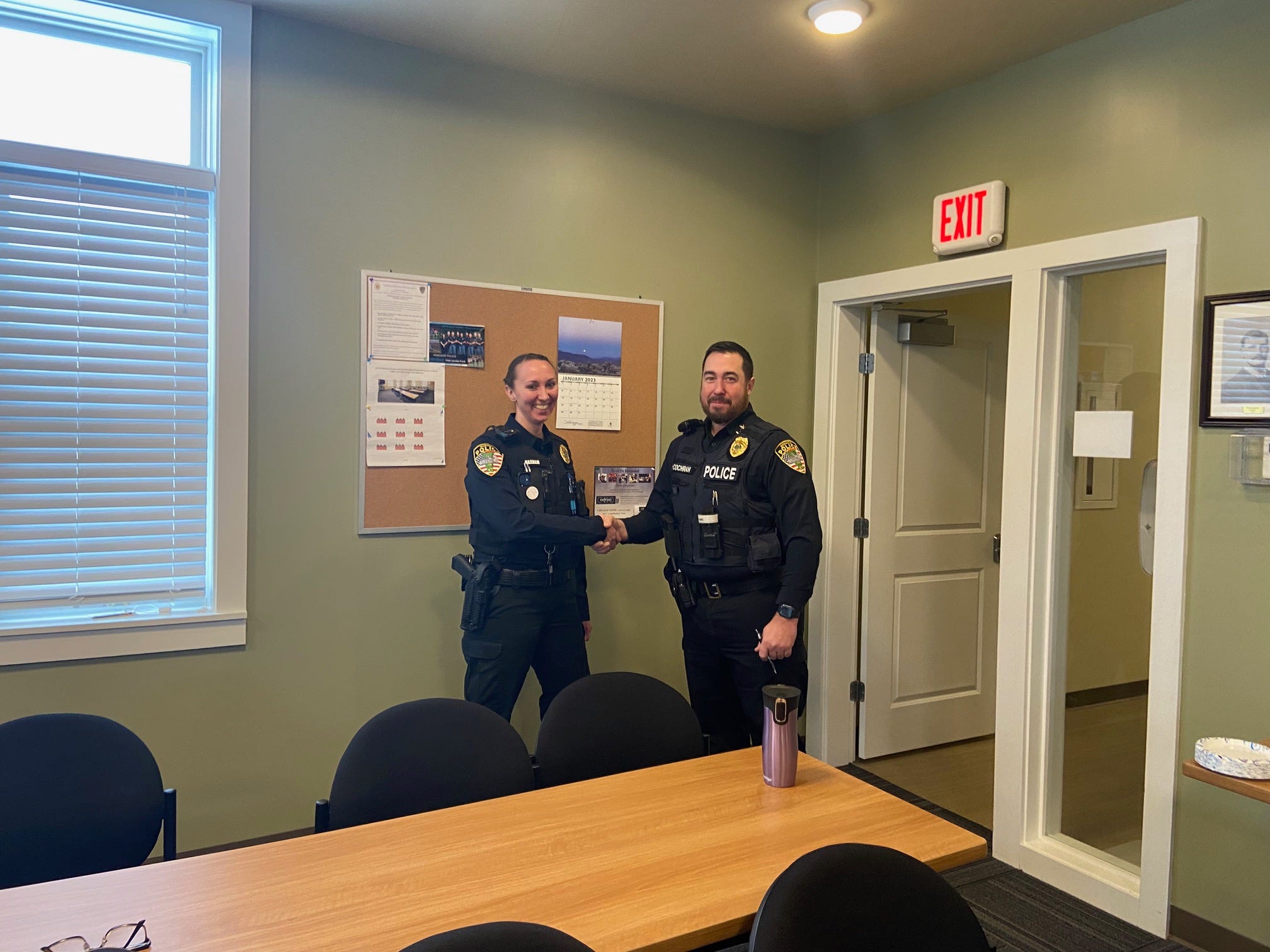 Chief Wade Cochran welcomes Officer Chelsea Maxham on her first day at the Norwich Police department at the Coffee with the Cop event.