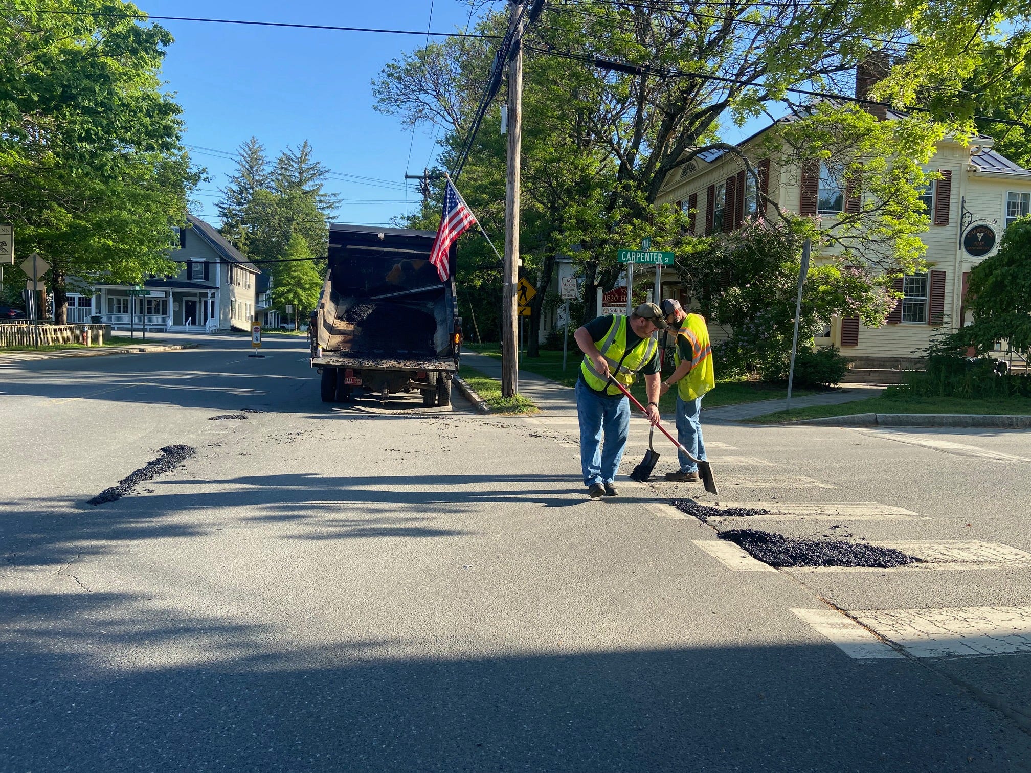 Just down the street, the DPW is on hand to spread some patch on the cracks in the road.