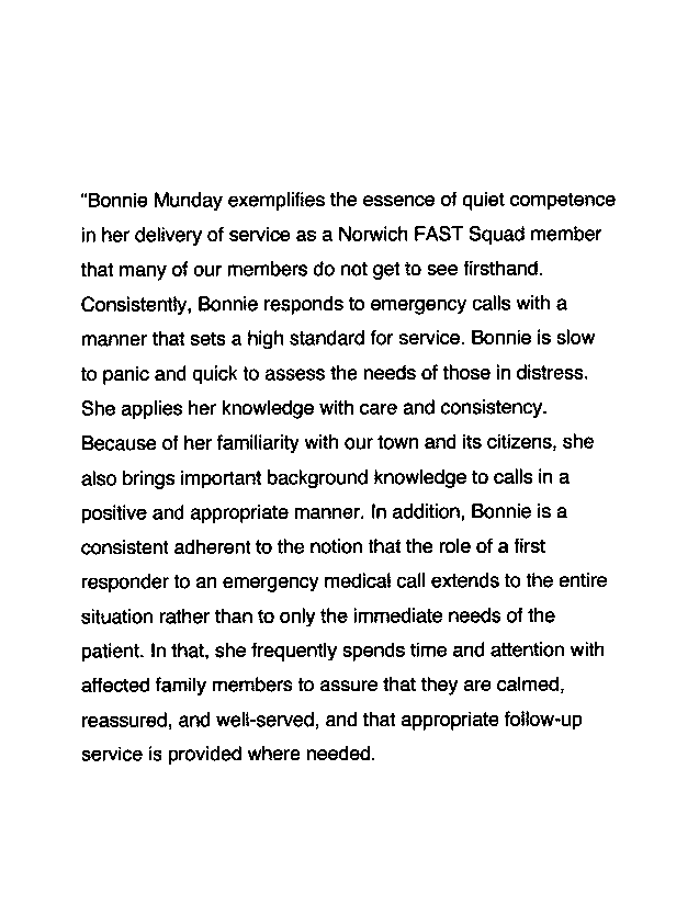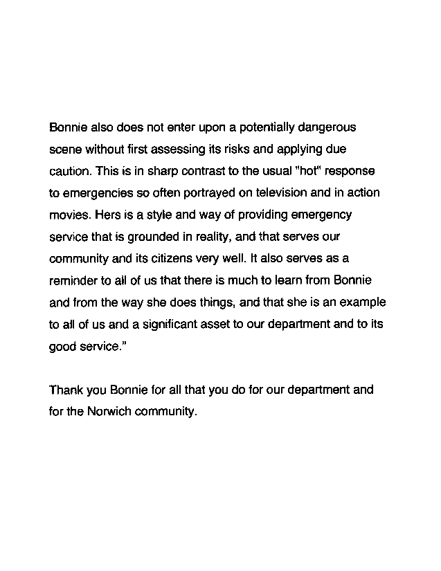 Bonnie and I were on our first FAST Squad call together (and I think the first Norwich FAST Squad call at all)! Bonnie has set the standard for public service in Norwich. It has been a pleasure and an honor to work with her and to know her.