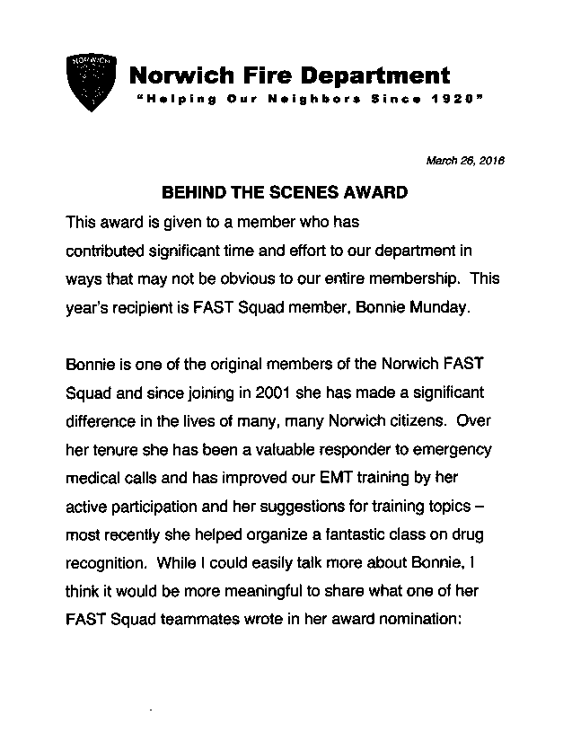 I’ve included the speech I gave on March 26, 2016 when I presented Bonnie the Norwich Fire Department’s “Behind the Scenes Award” at our annual NFD dinner.