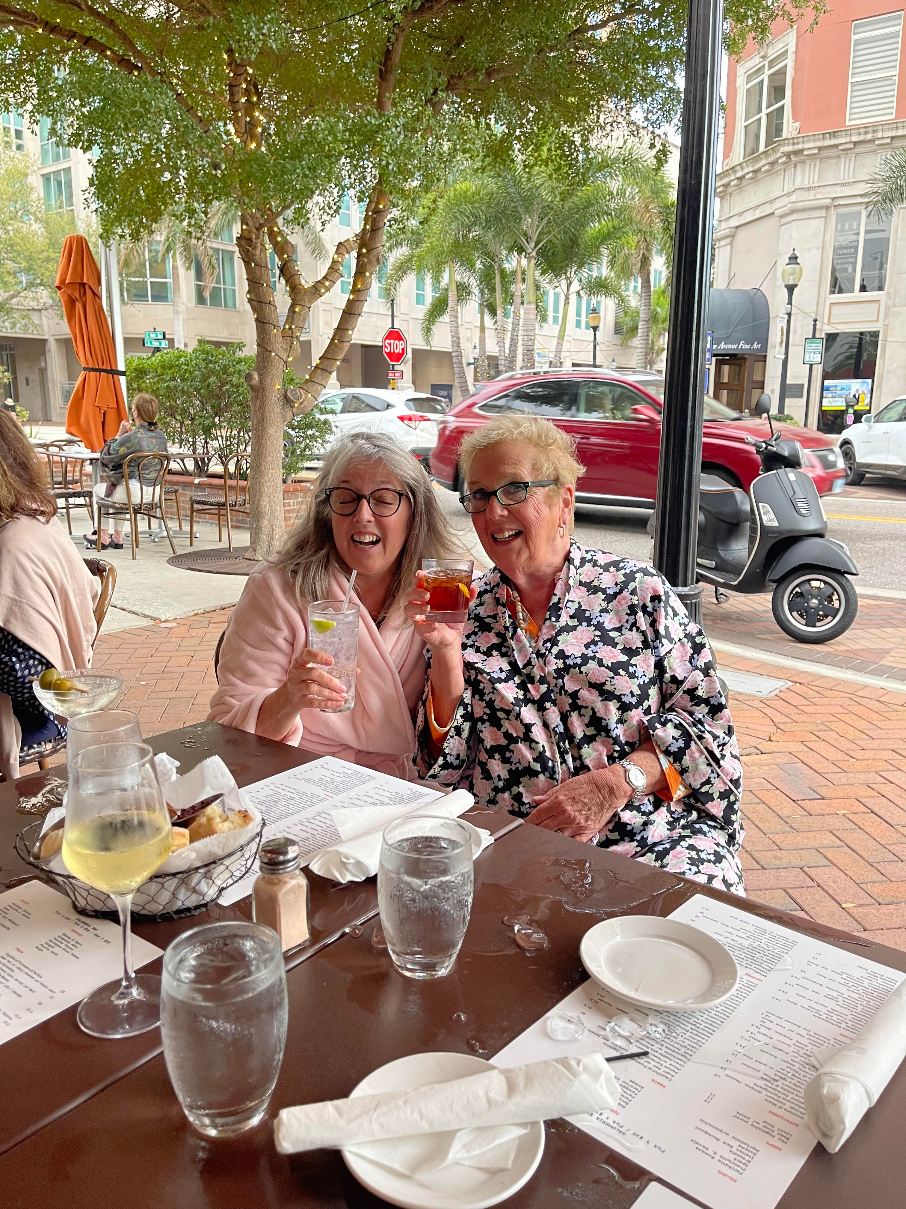 On a swanky corner of Sarasota, Florida, at a charming cafe, these women enjoy a brown drink and a clear one in their bathrobes. They cleaned up before the police arrived. (Photo sent in for this event) And there may be more!