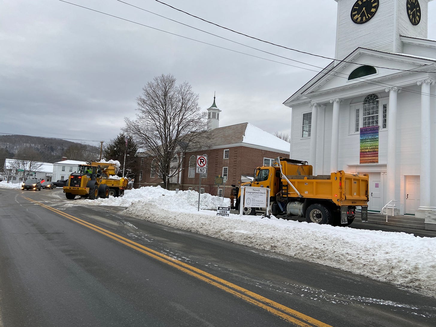 This morning bright and early, I witnessed a very nice concentrated effort to remove snow from the Town Hall on the Church Street side so that cars would be able to park once again. On my way to work, I saw a sudden surge of trucks and a Bulldozer or Payloader if you will. Check out the photos below: