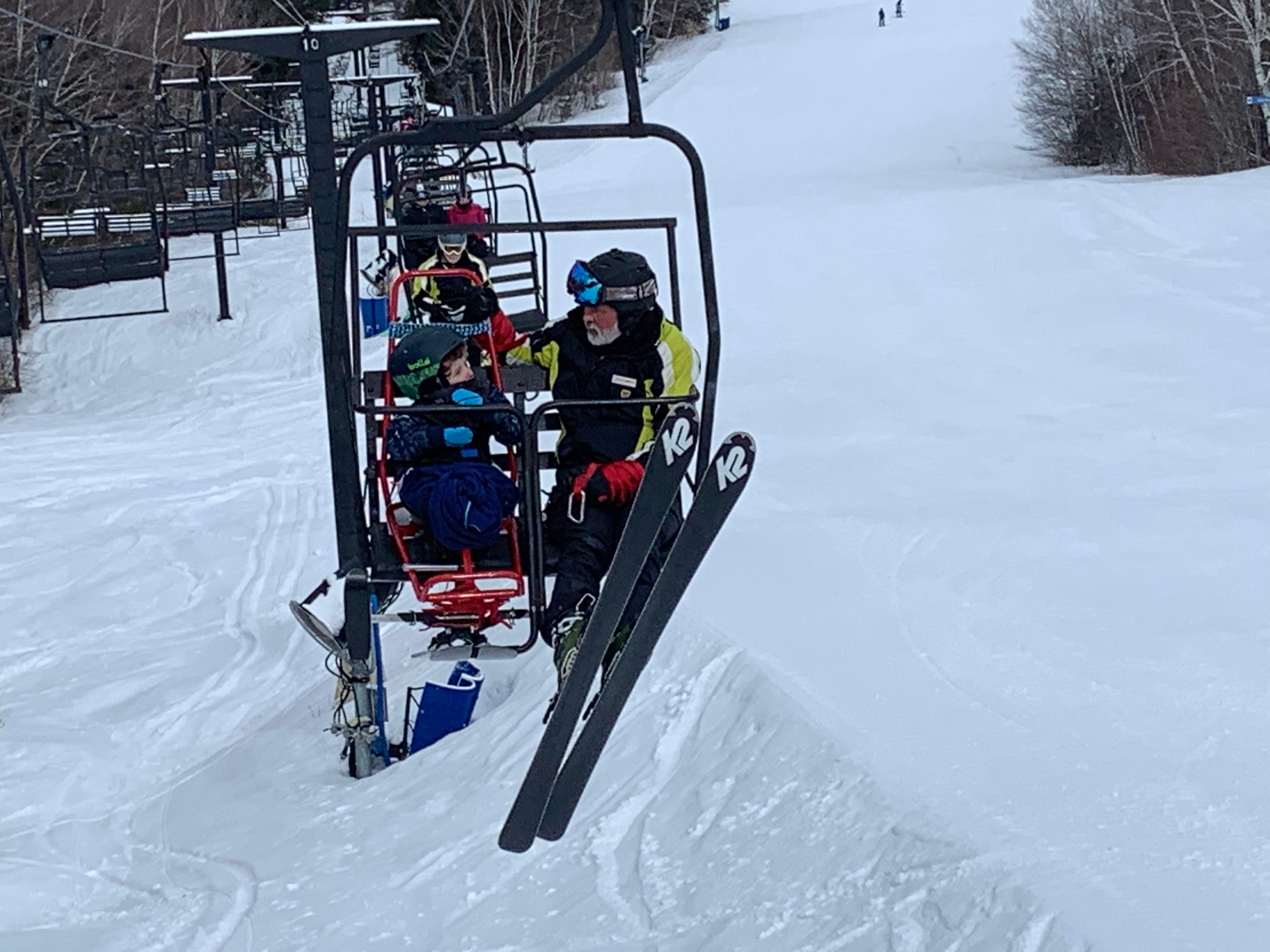 Ethan rides the chair lift with his instructor discussing the trail conditions