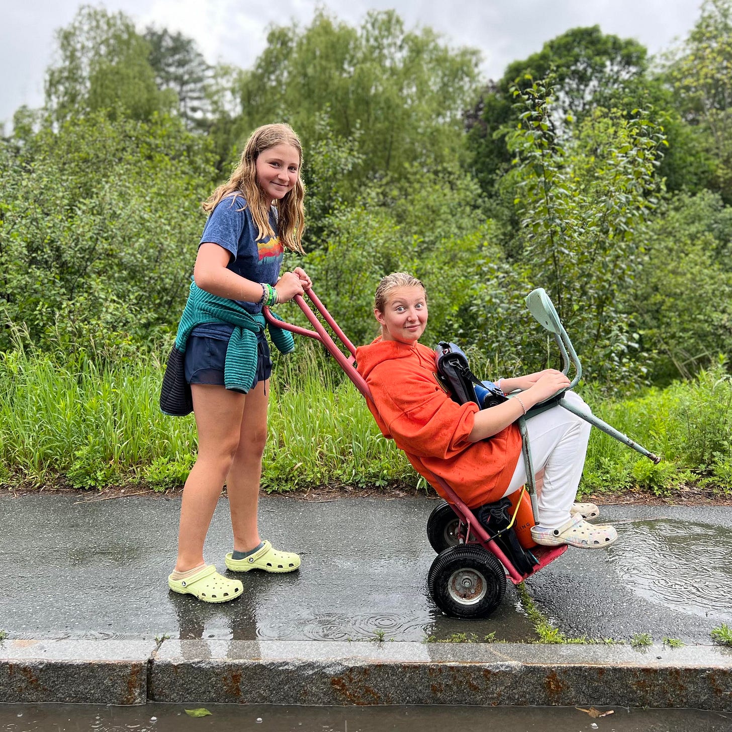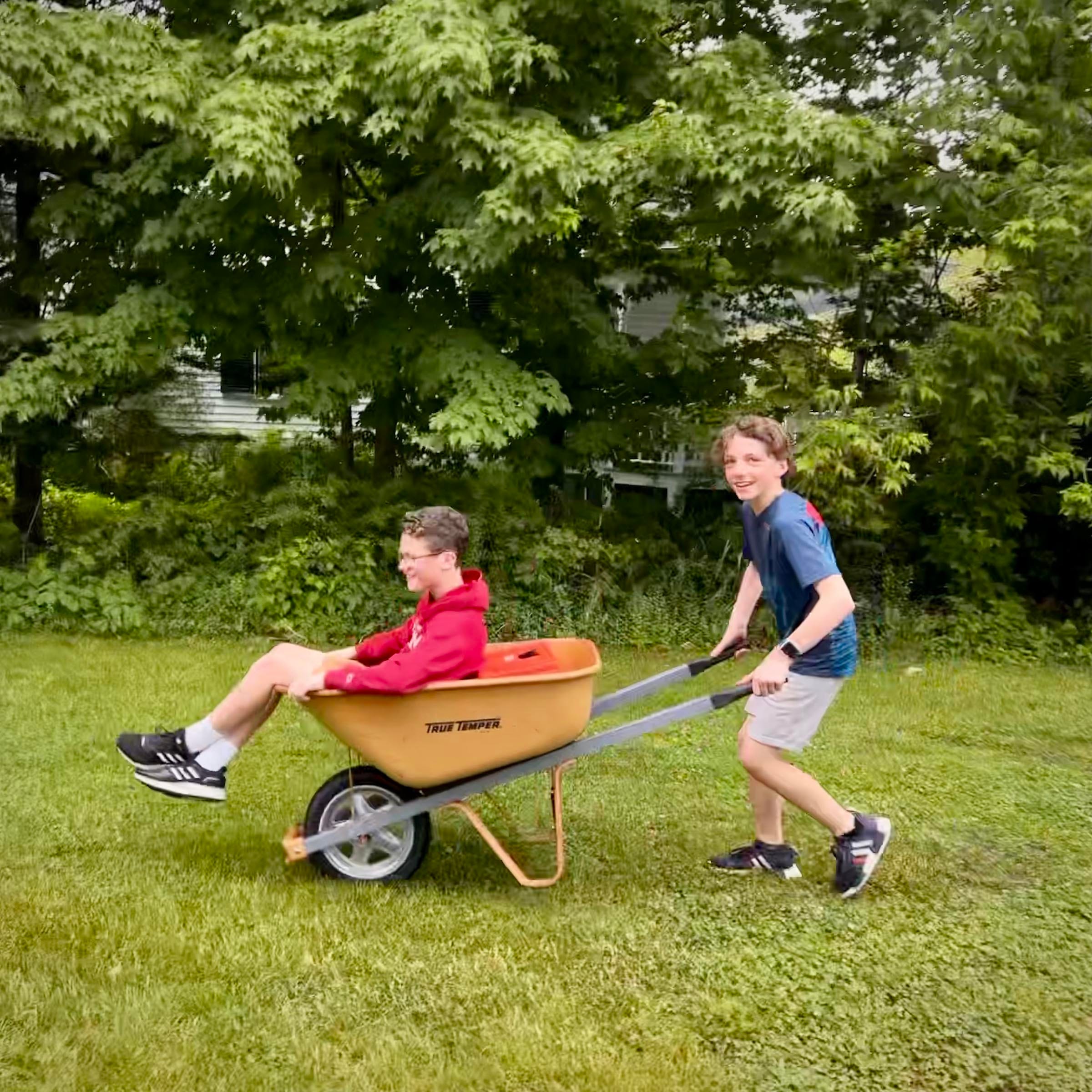 Another alternative transportation method. Ryan and Rowan are having fun on their way home from school. I guess a free ride in a wheelbarrow is better than walking. I wonder if the bookbags made it into the wheelbarrow (photo taken by Emma Cottage).