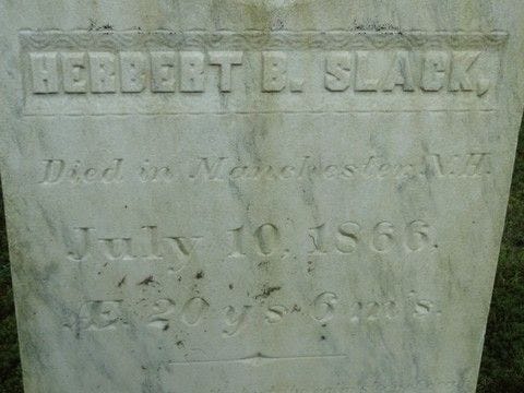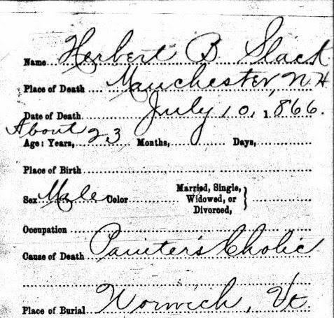 Sadly, Herbert died in July 1866, a little more than a year after his marriage. His death record lists his cause of death as Painter's Cholic. A quick search revealed that it was another name for lead poisoning. Herbert probably got this while working as a machinist in the factory where he worked with lead paint. He's buried in Hillside Cemetery here in Norwich.