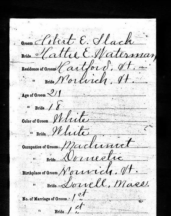 Herbert’s marriage certificate reveals that he and his wife Hattie Waterman married in Lebanon. He was a mechanic and she was a domestic, or a maid. I find it interesting that Hattie was living in Lowell, Mass at the time of the marriage. Could she have left her farm in Norwich to work in the mills like so many other young women? In her diary, Mary mentions going to the mills in Manchester to see Herbert and Hattie. Even though they lived in Manchester, they still came back to Norwich for visits.