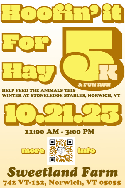 StoneLedge Stables, located right here in Norwich, is a 501(c)3 that provides hands-on educational farm programs for preschool children. All proceeds from this event go to our “Hay Fund” to feed our animals during the winter months. We feed our farm animals over 500 bales of Sweetland hay a year—best hay in the Upper Valley, according to our herd!