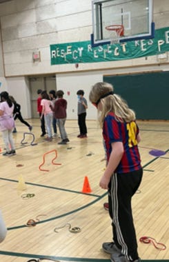 This week our focus was on planning and patience. Students had to patiently wait while their classmates unwrapped a gift and then played “jumping beans” as a way to practice self-regulation. To work on planning skills, kids had to make a plan to try and beat their partner to the endline and also played a game that required them to plan a route as a whole class to cross the gym without falling into the “lava pit”.