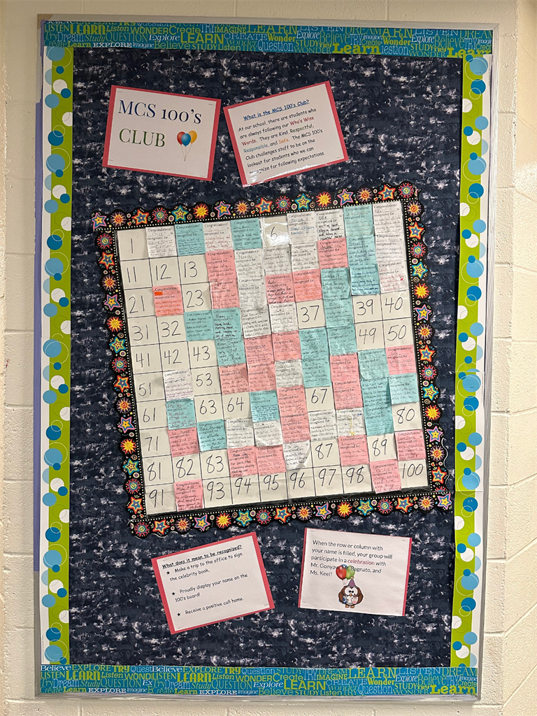 Welcome back 100s Club! For those of you returning to MCS, you may remember the 100s Club. For new families, here is a brief description. At MCS, we believe in recognizing students for doing the right thing. Being a Positive Behavior, Intervention, and Support (PBIS) school, we subscribe to the belief that more attention should be given to positive behavior than unexpected behaviors.