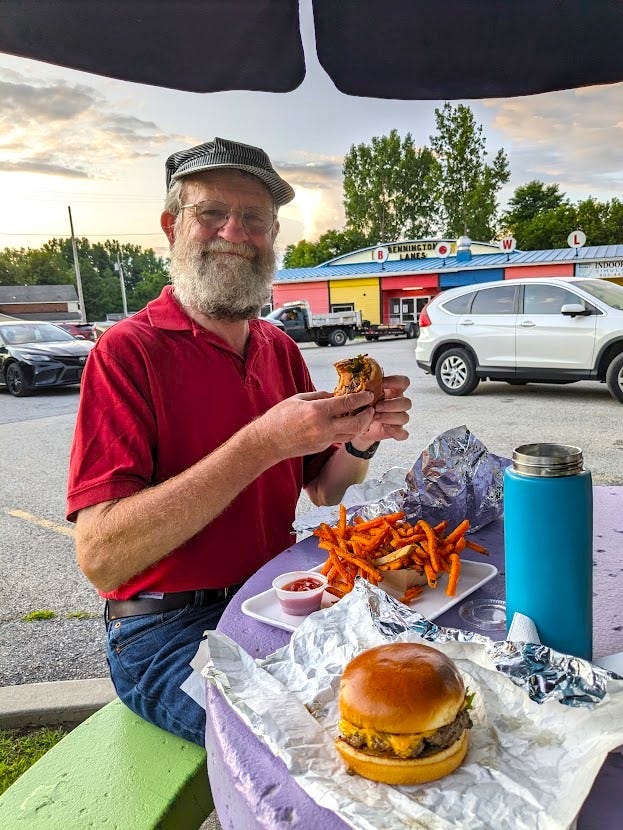 Me, enjoying a hamburger in Bennington, VT, where my wife Mary had come down for a short visit.