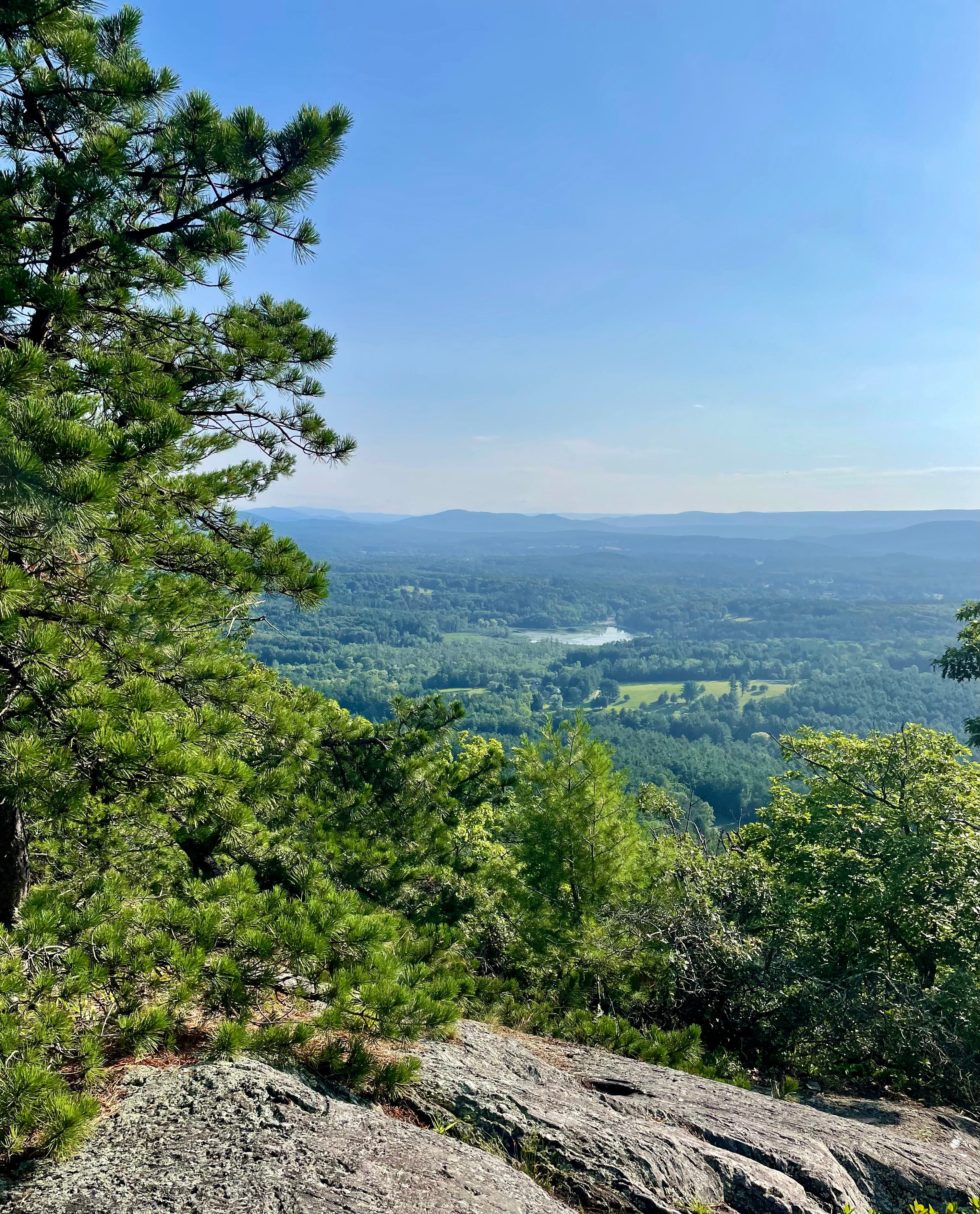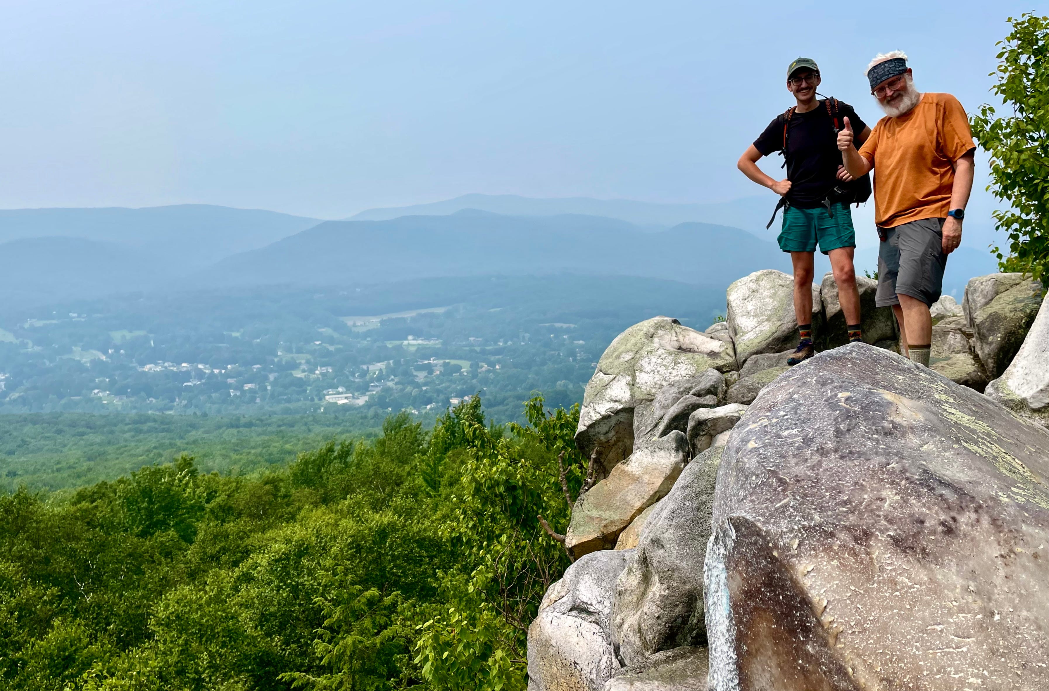 A ledge above Cheshire MA. The guy on the left (trail name "Professor Sprout" who taught botany) said he'd had to leave the Trail for a week to recover from a snake bite. The guy on the right ("Chuckster") was one of the few hikers I met who, at 71, was older than I (at that time 70). Mt. Greylock, the highest point in MA, would be visible in the background, but for all the Canadian wildfire smoke.