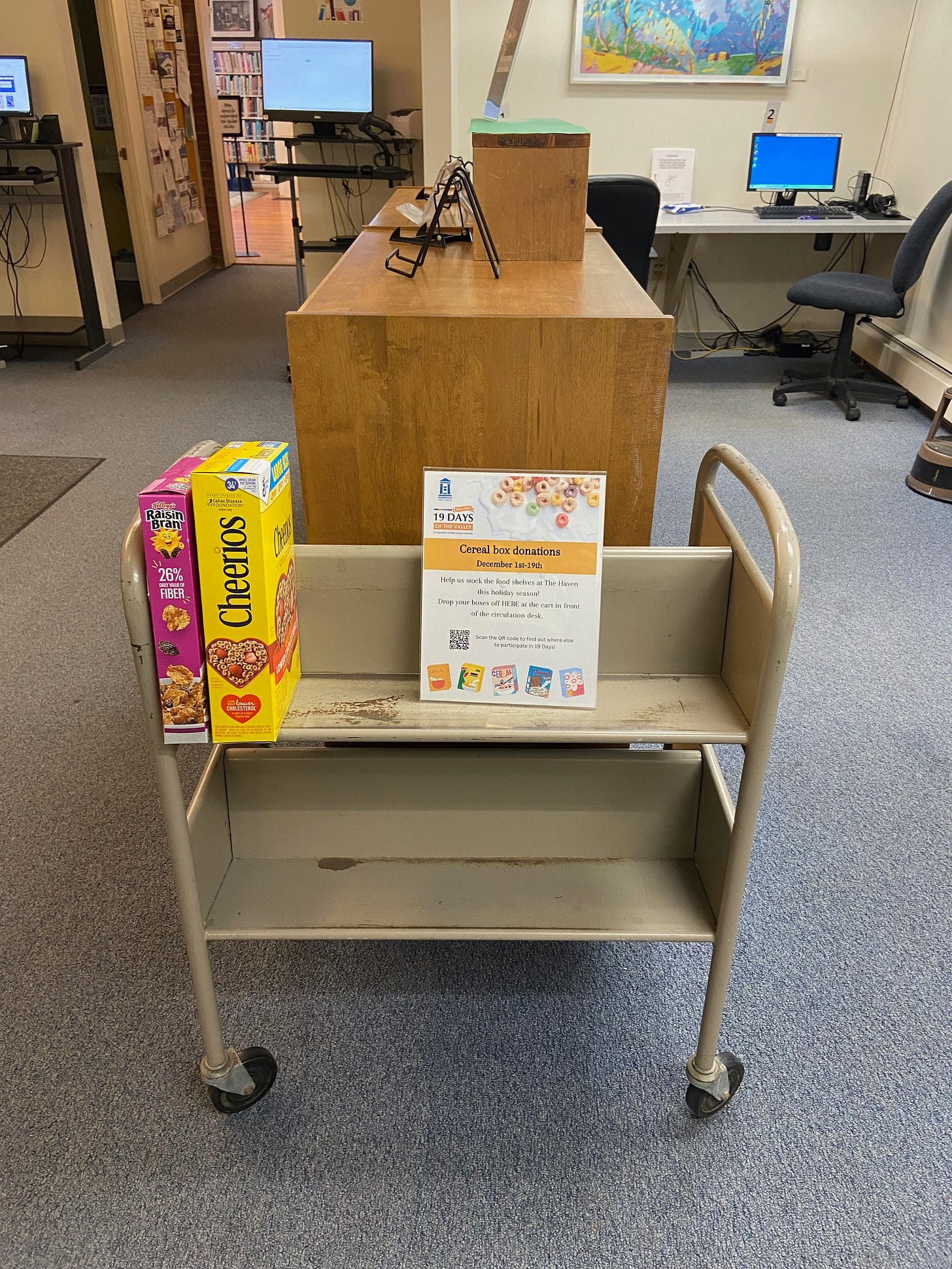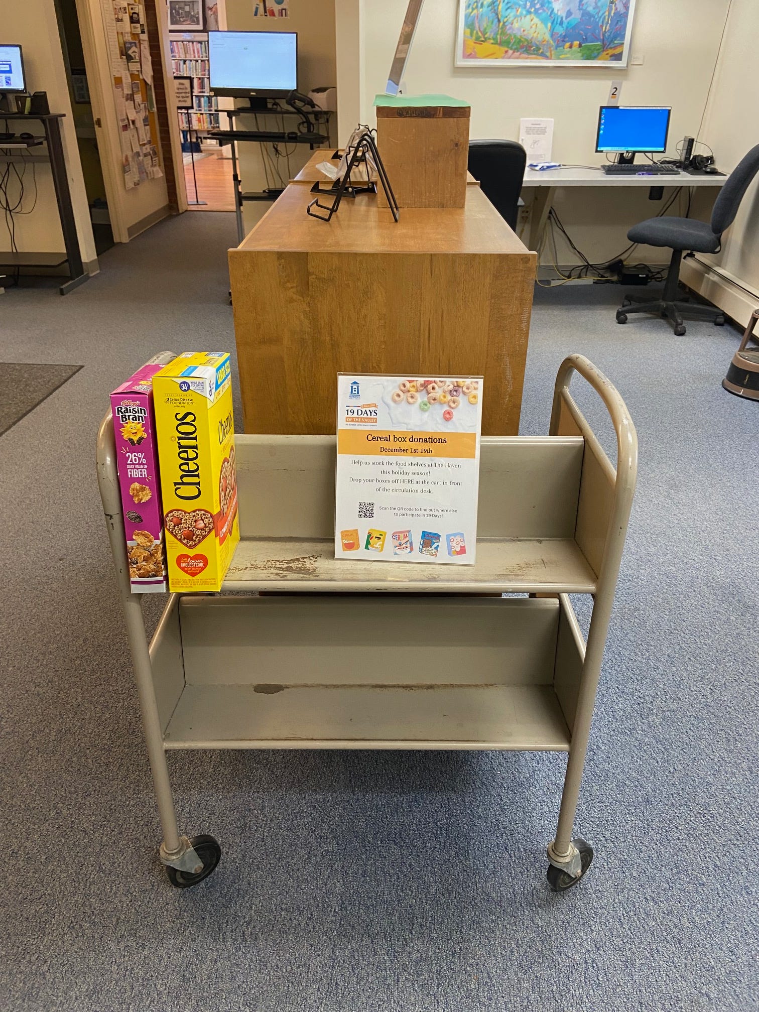 Designated cart for your donations inside the library.