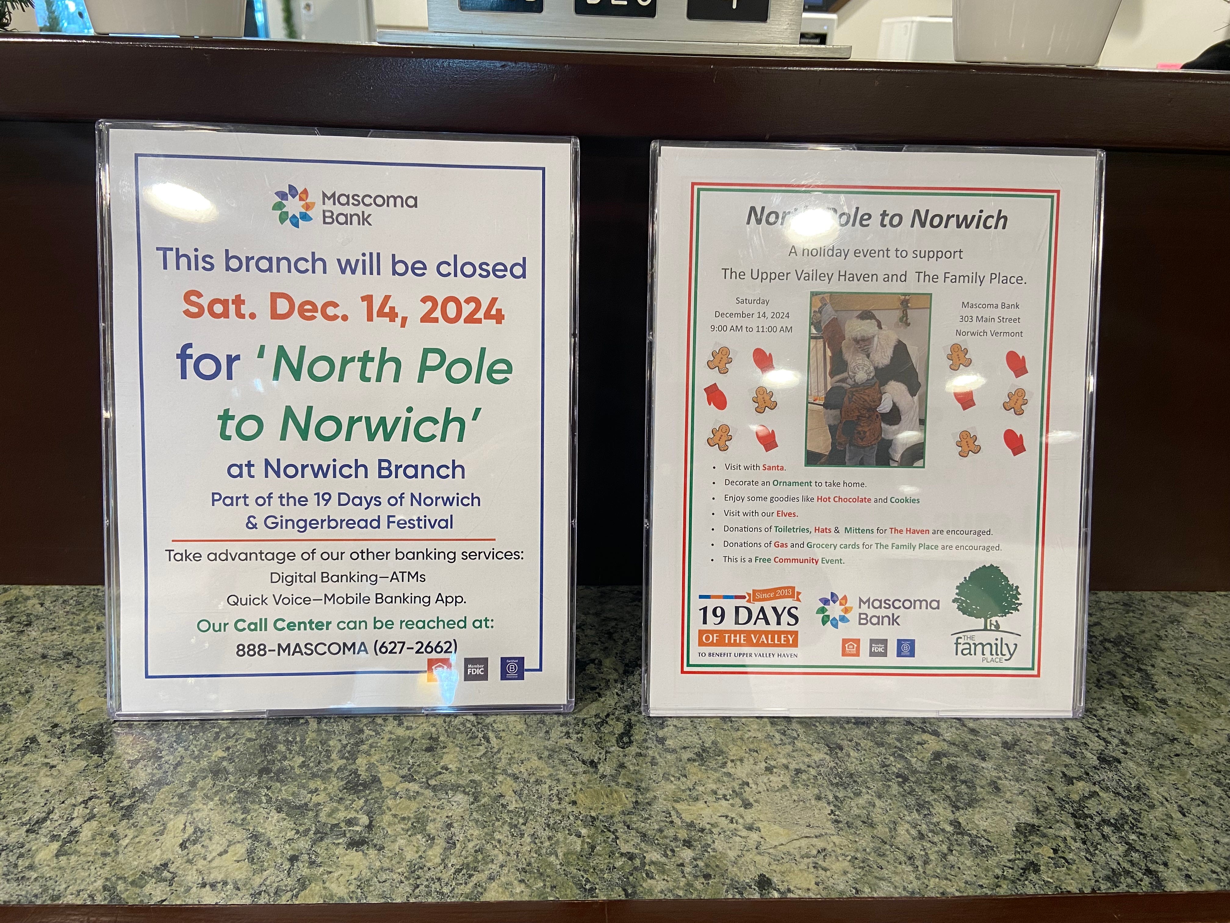 Christmas movies at the Nugget on Friday, and North Pole to Norwich at Mascoma Bank on Saturday, December 14th. See more here: https://uppervalleyhaven.org/events/19days/featured-activities/