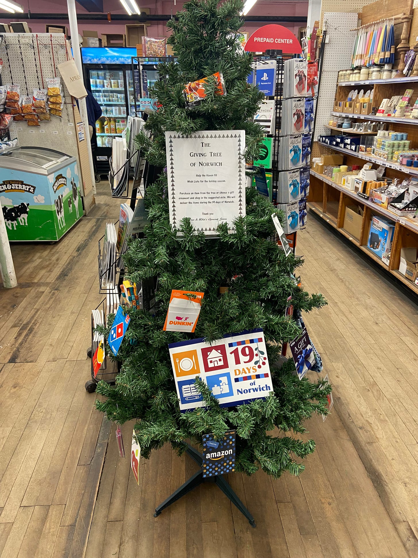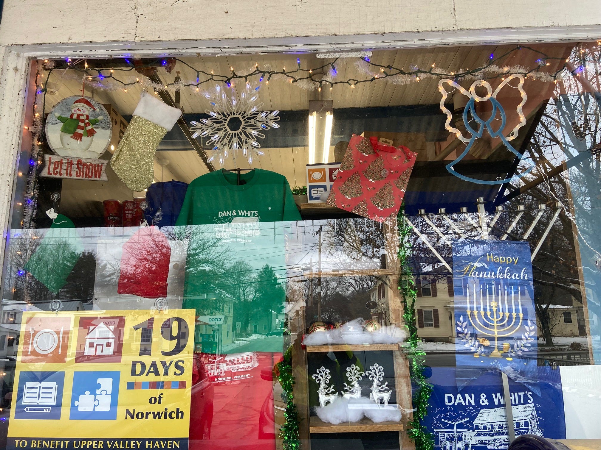 The front window of Dan and Whit’s proudly displays the 19 days of Norwich poster and a few ways/programs to help you select items to donate…Just stop at the desk to inquire if you have any questions. danandwhits.com