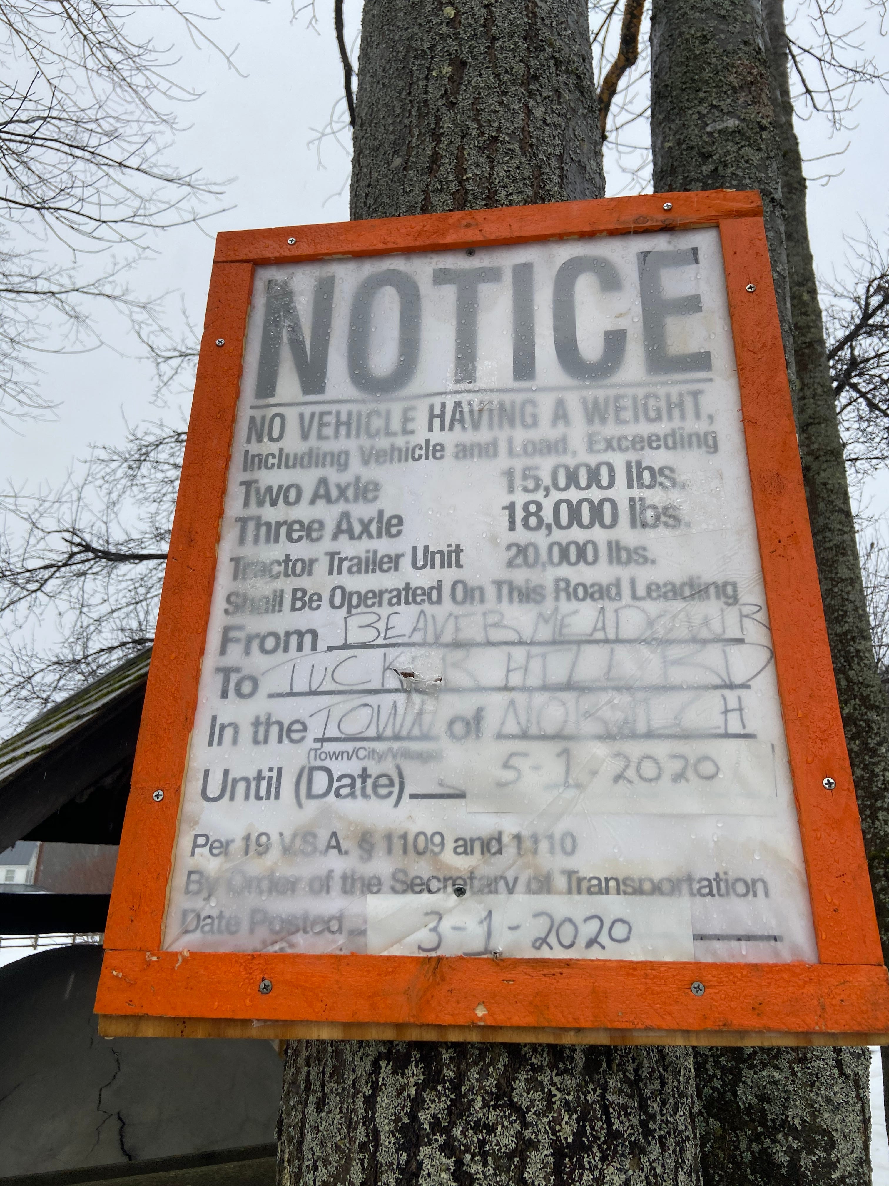 The roads in the Town of Norwich VT. will be posted for weight limit due to spring conditions effective March 1, 2020 until May 1, 2020 or until otherwise notified.