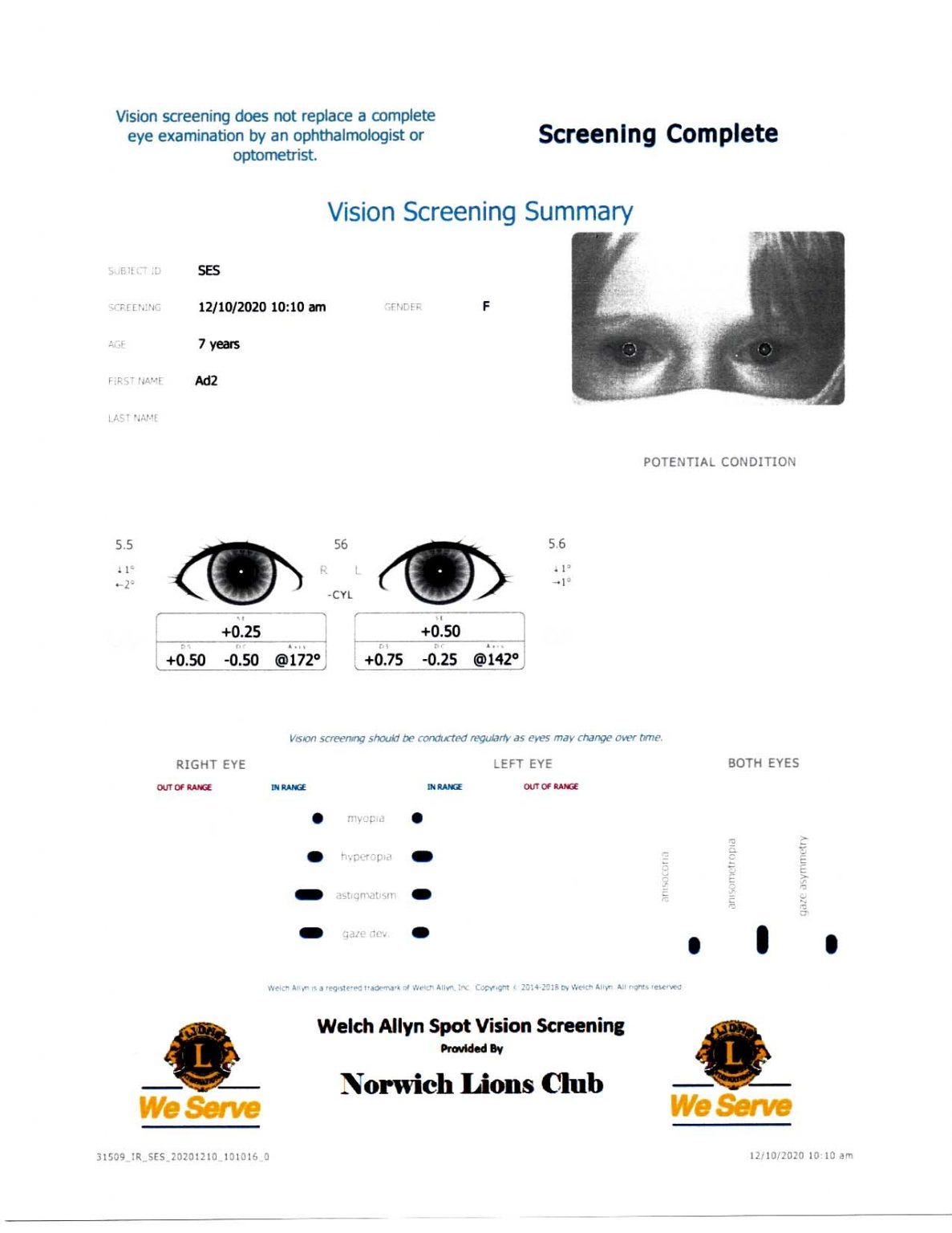 The spot screening device replaces the traditional use of an eye chart for screening children and provides much more information. Typically, a subject can be screened in under a minute and screening results in a printed report for the school nurse’s files. Out-of-range values are highlighted for the nurse to advocate follow-up by an optometrist or ophthalmologist to the child’s parents. Typically, about 10% of those screened result in out-of-range readings. Of the 138 children screened, 13 registered out of range.
