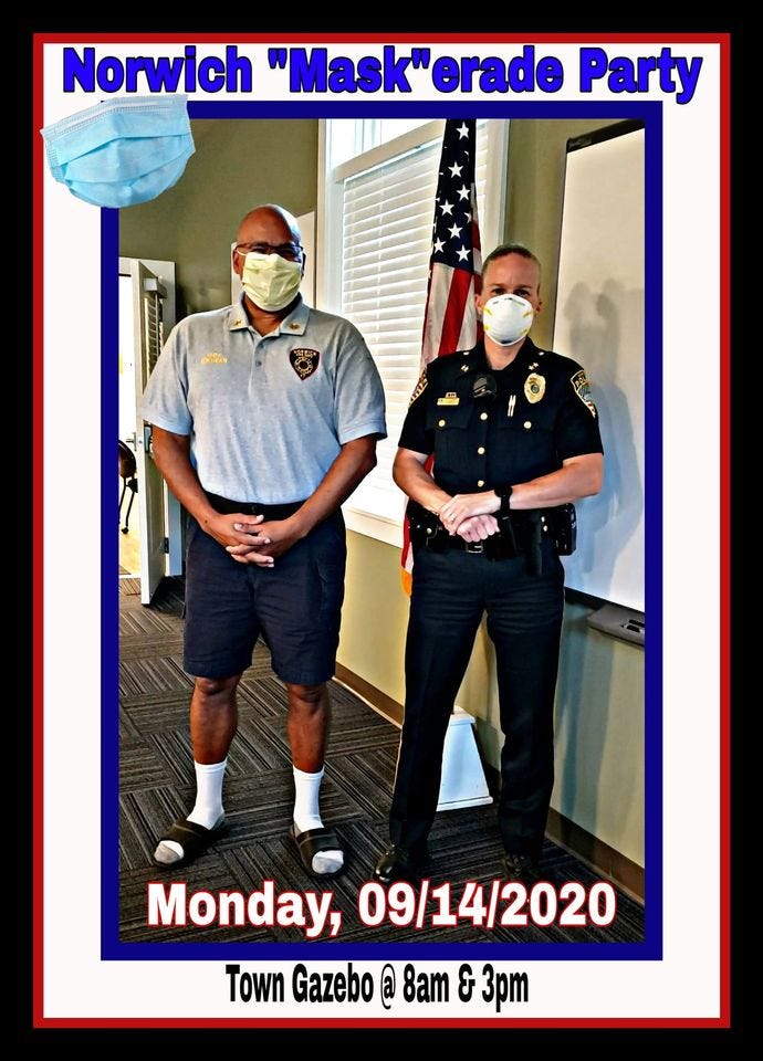 The Norwich Police and Fire Departments invite you to a social distance “Mask”erade party being held at the Town Gazebo on Monday, 09/14/2020. The Police and Fire Departments will be handing out packages of cloth masks to Norwich residents obtained through a VT Emergency Management grant sponsored by the Town Managers office. Come line up at the social distance hash marks and receive your free package of masks!