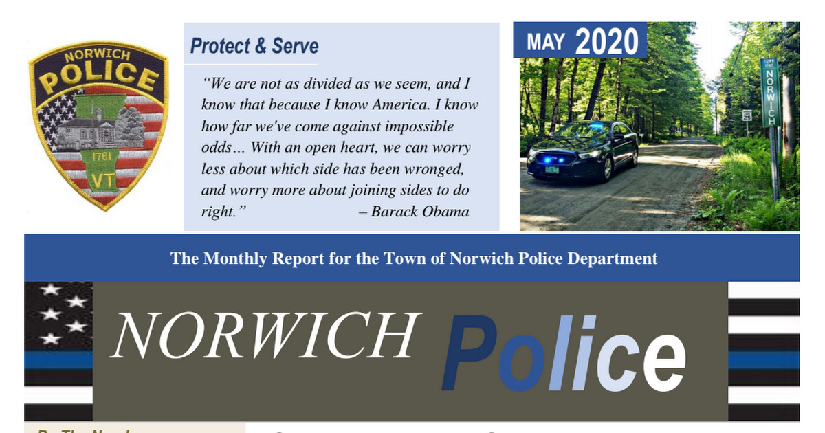 Good Morning Norwich and Upper Valley residents. I hope everyone is staying safe and enjoying life every day. I am posting the latest newsletter from the Norwich Police department so as to keep you informed. It is always loaded with the facts,guidance and advice you need to keep you safe. There is always a nice monthly report with updates of community events that take place and involve the community and the police.