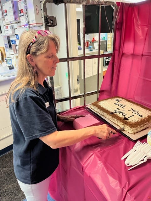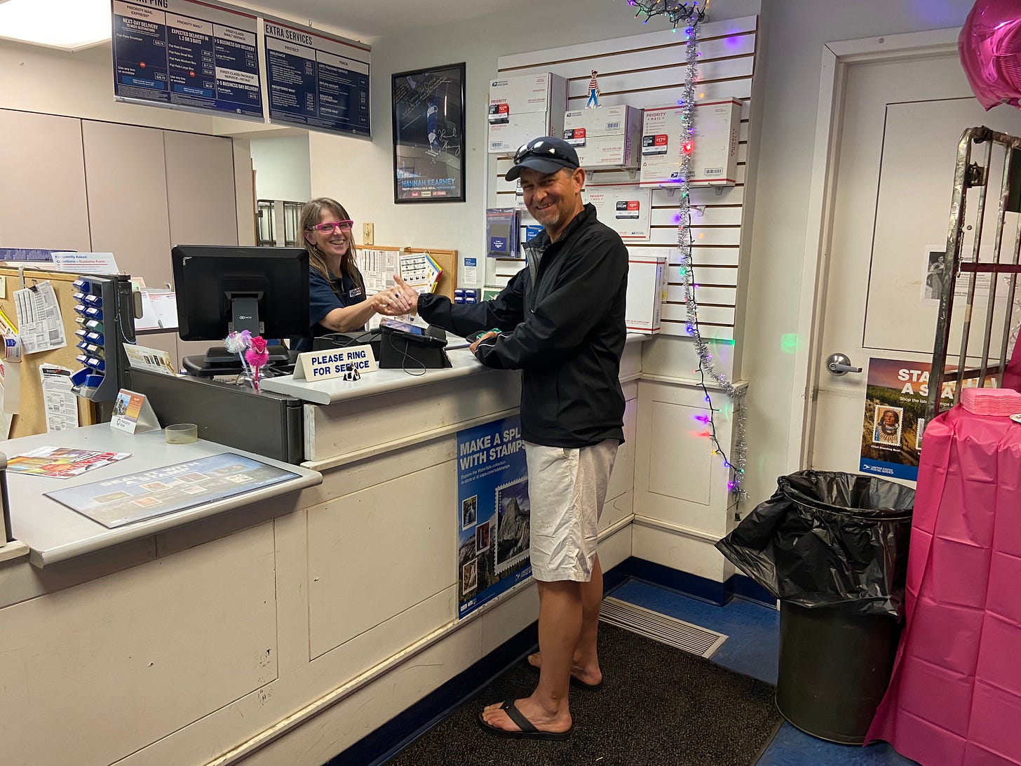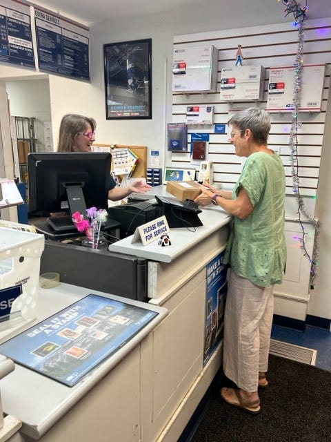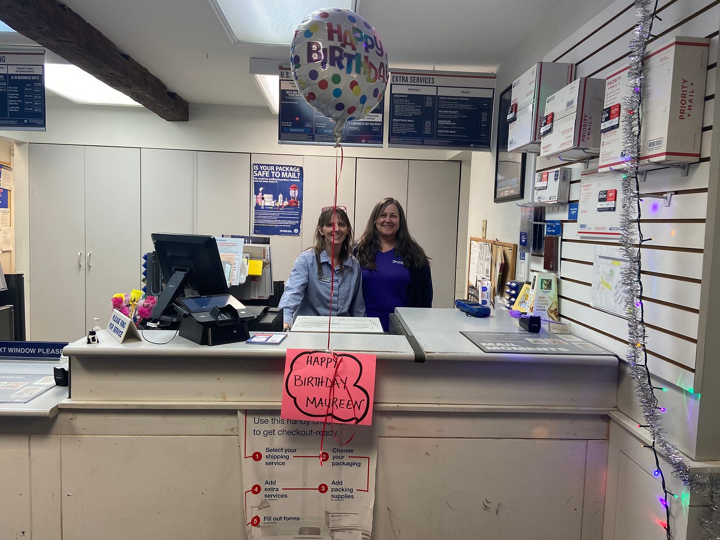 And I also noticed this sign wishing window clerk Maureen Chase good luck in her new assignment. She will be working in the South Strafford Post office effective 7/5/2023.