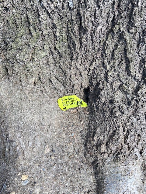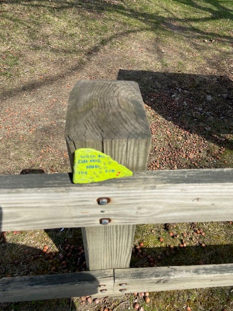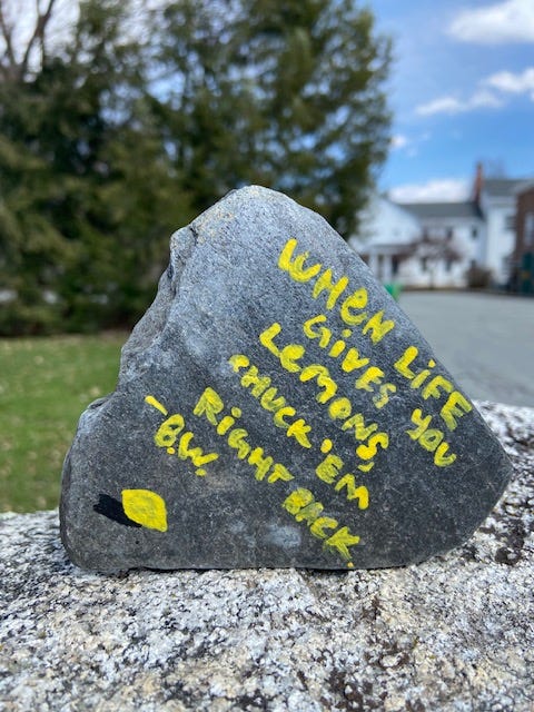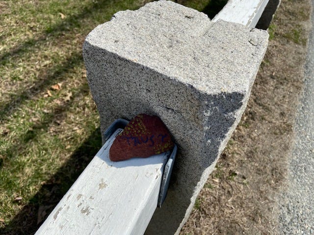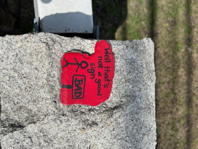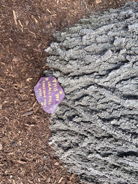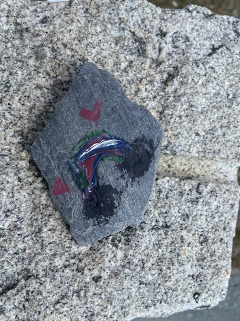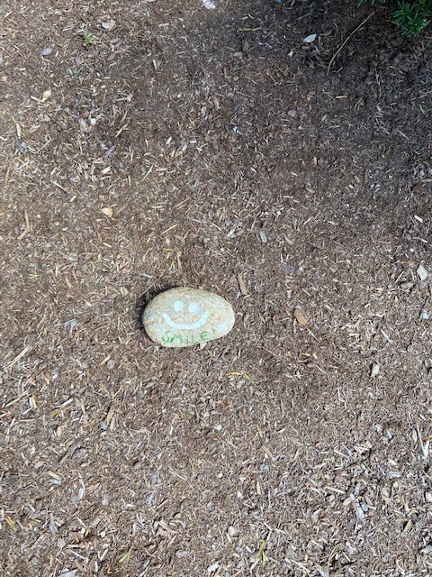 As I was out for my afternoon walk today I noticed a painted rock at the base of a tree, and a little further on I saw another and yet another and so on. Check out the photos and see what our rock stars created. Not wanting to disturb the individual masterpieces, I took the photos as they appeared and did not rearrange them.