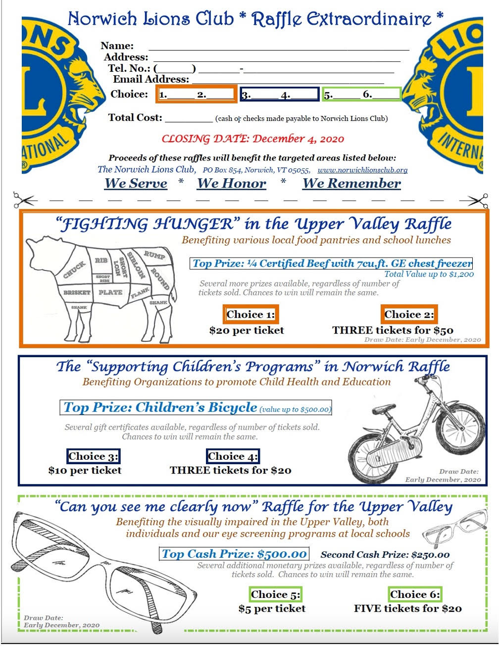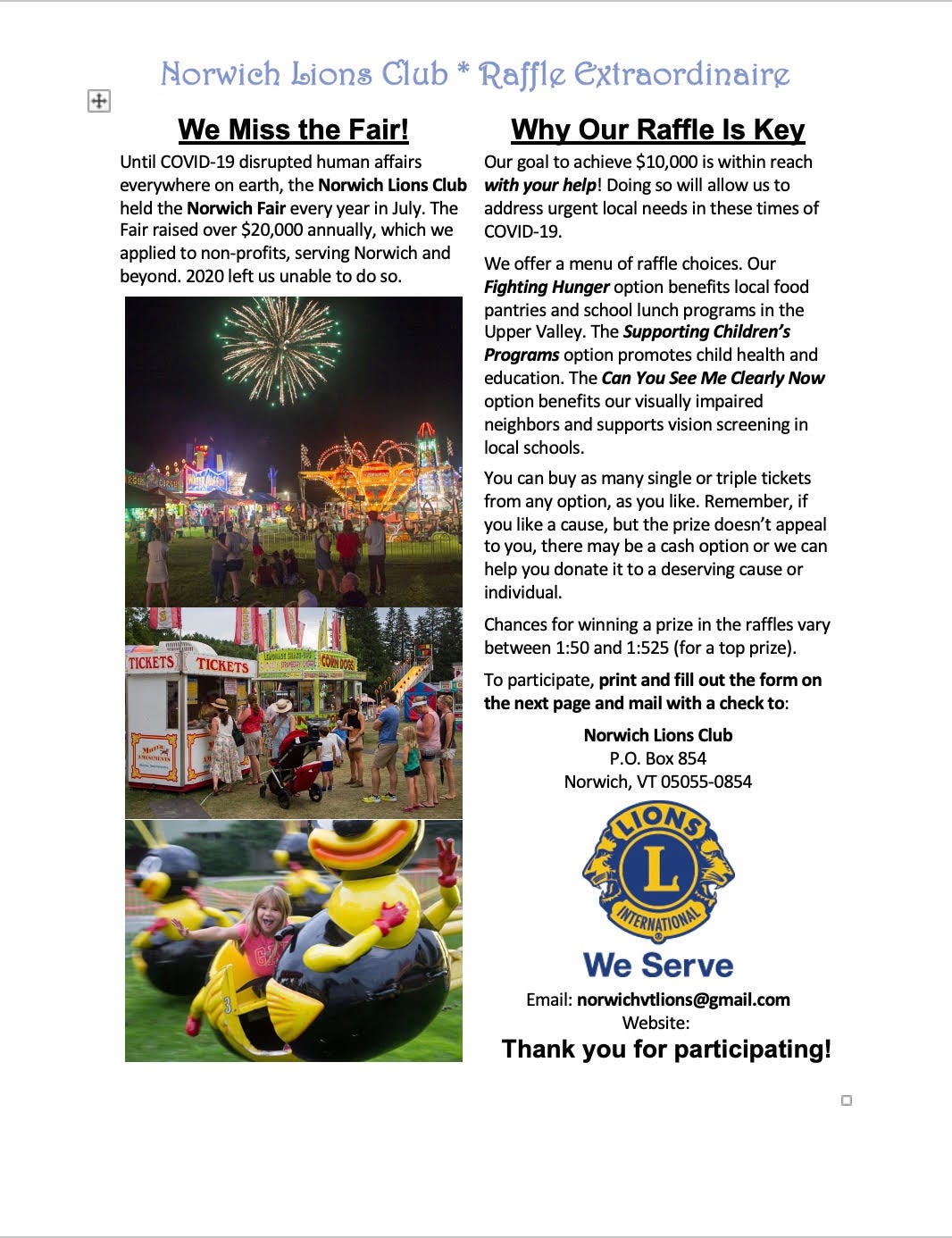 I just wanted to remind you that there are only a few days left to participate in the Norwich Lions club raffle. Your help with this raffle will help us help others.