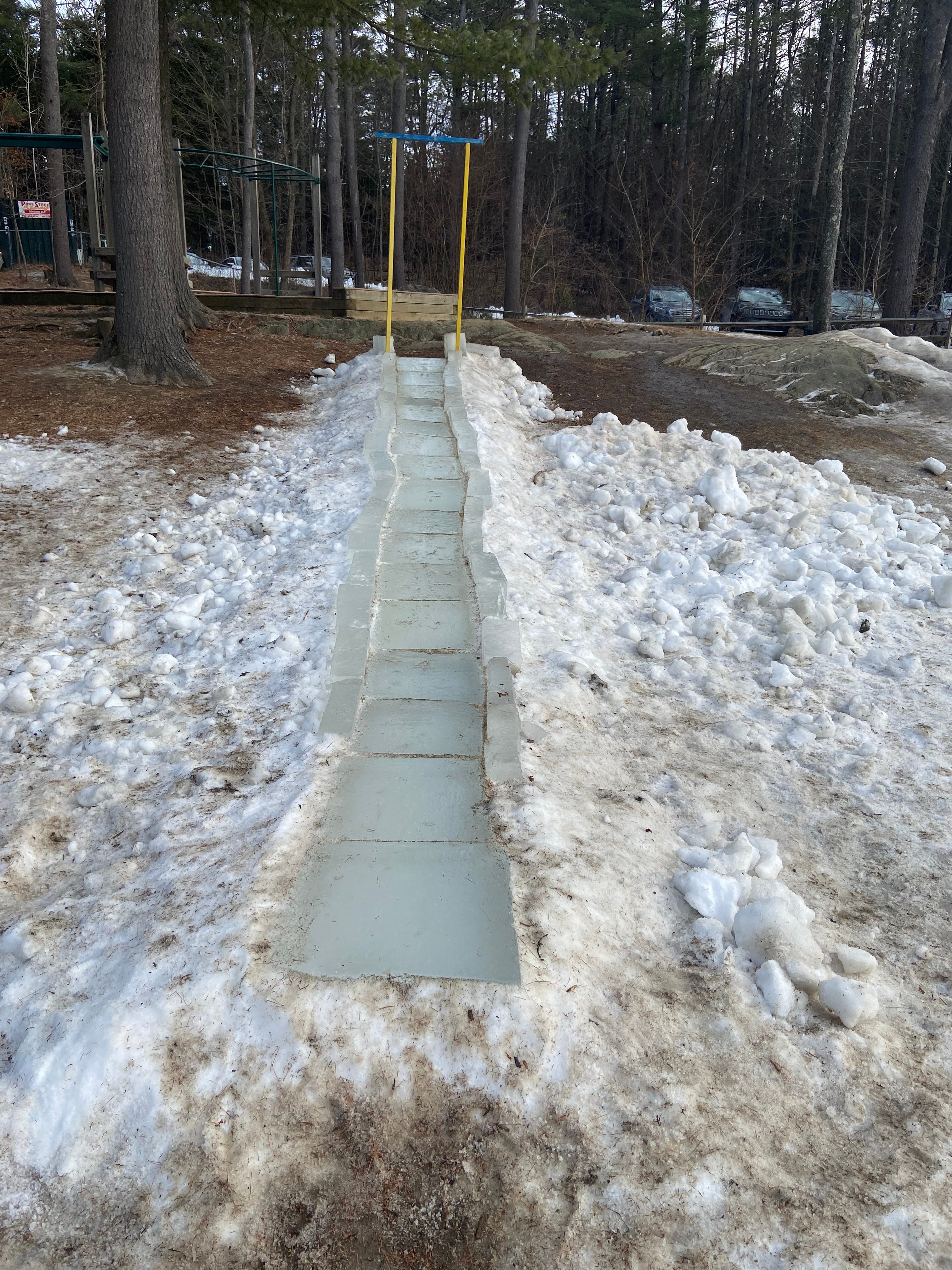 Bill Young, a Hanover resident and retired Hitchcock OB happens to be not just an ice enthusiast but an ice play devotee. He is the force behind ice slides at Occom Pond, the Ray School, MCS (past and now present) and now at the West Lebanon and Lebanon elementary school. We met over the summer and he recruited me to bring the ice slides back to Norwich.