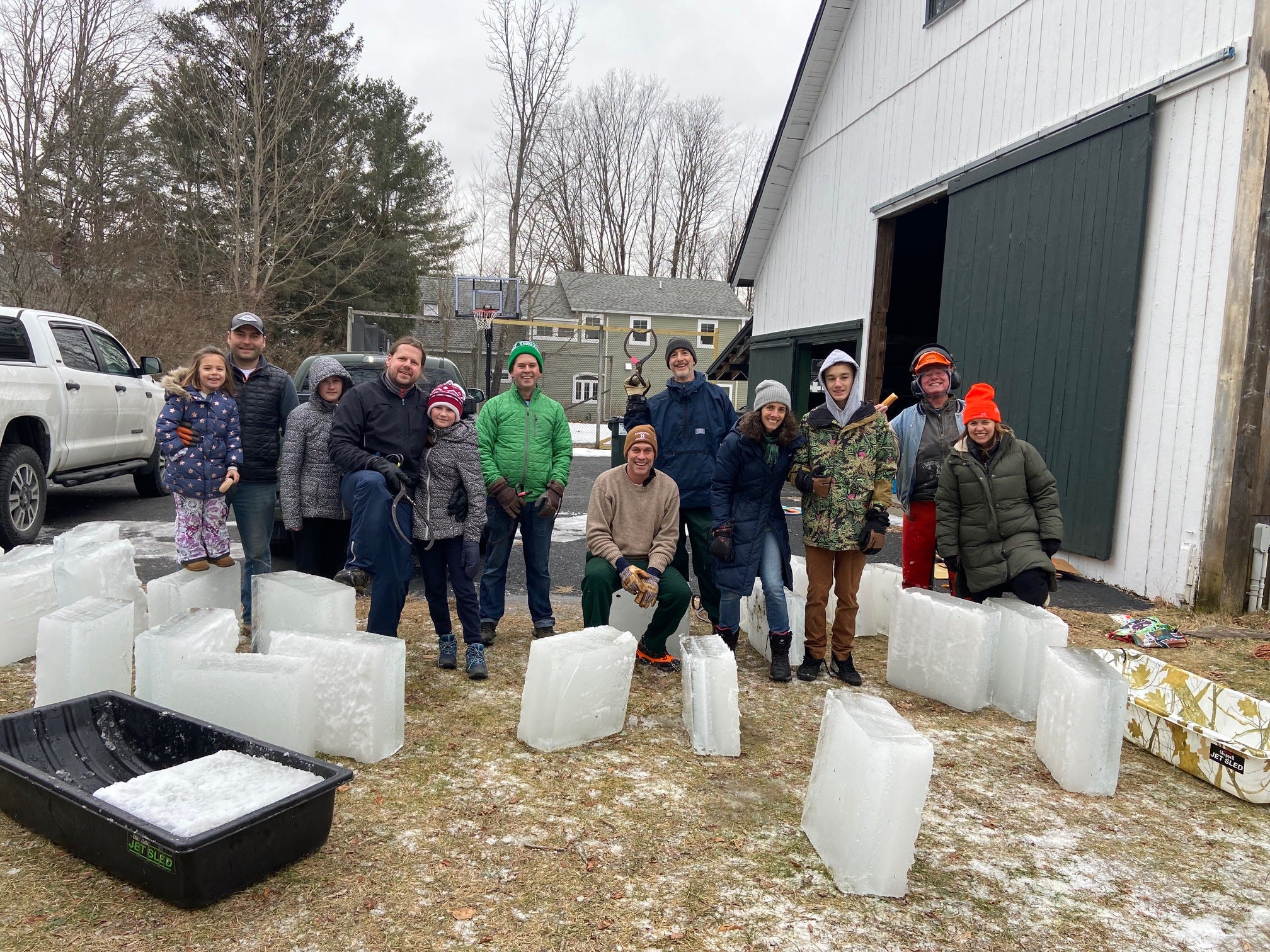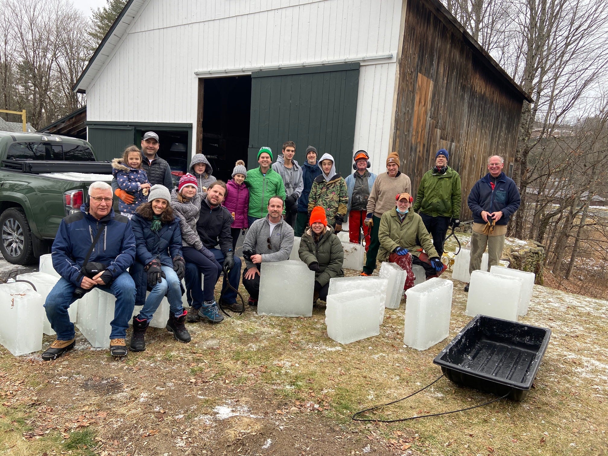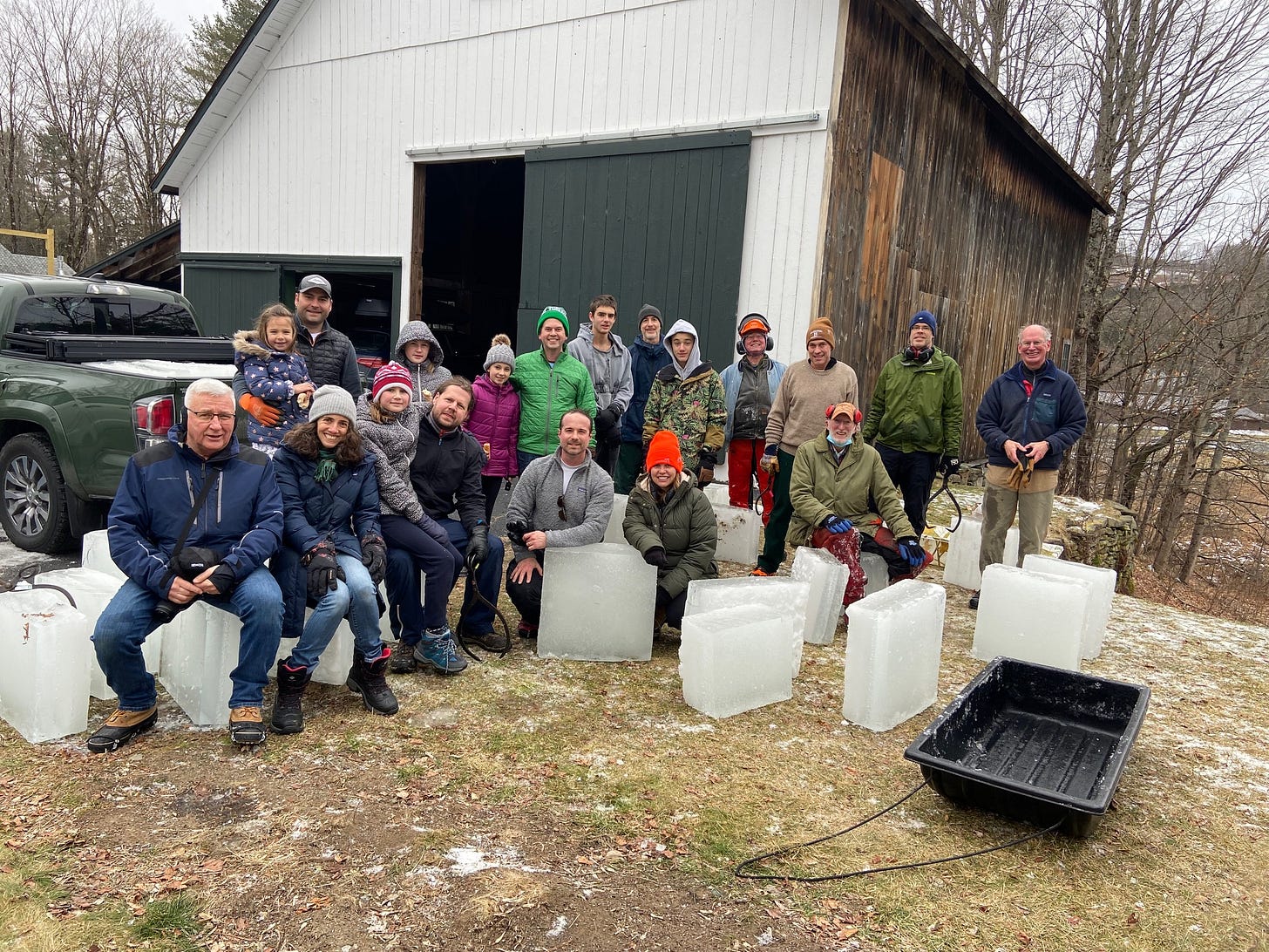 After some discussions on logistics, and some unseasonably warm weather, we came to realize that the best and most efficient way to harvest ice for the slides was from my pond! So Bill recruited his friend Hugh (Bill to let us know his last name) who is just an expert at cutting ice, we all recruited some strong and able bodies to capture the ice once it was released from the saw and then haul it up the hill, into trucks and off to the various schools. Participants were elementary school principals (West Lebanon’s Katie Roach), MCS’s own Greg Bagnato, and many parents and grandparents from all schools, including two Norwich teens and a few elementary students. All in all 20 grandparents, parents and kids participated from Hanover, Lebanon and Norwich. My role was largely getting the donuts from Muriel’s for refueling.