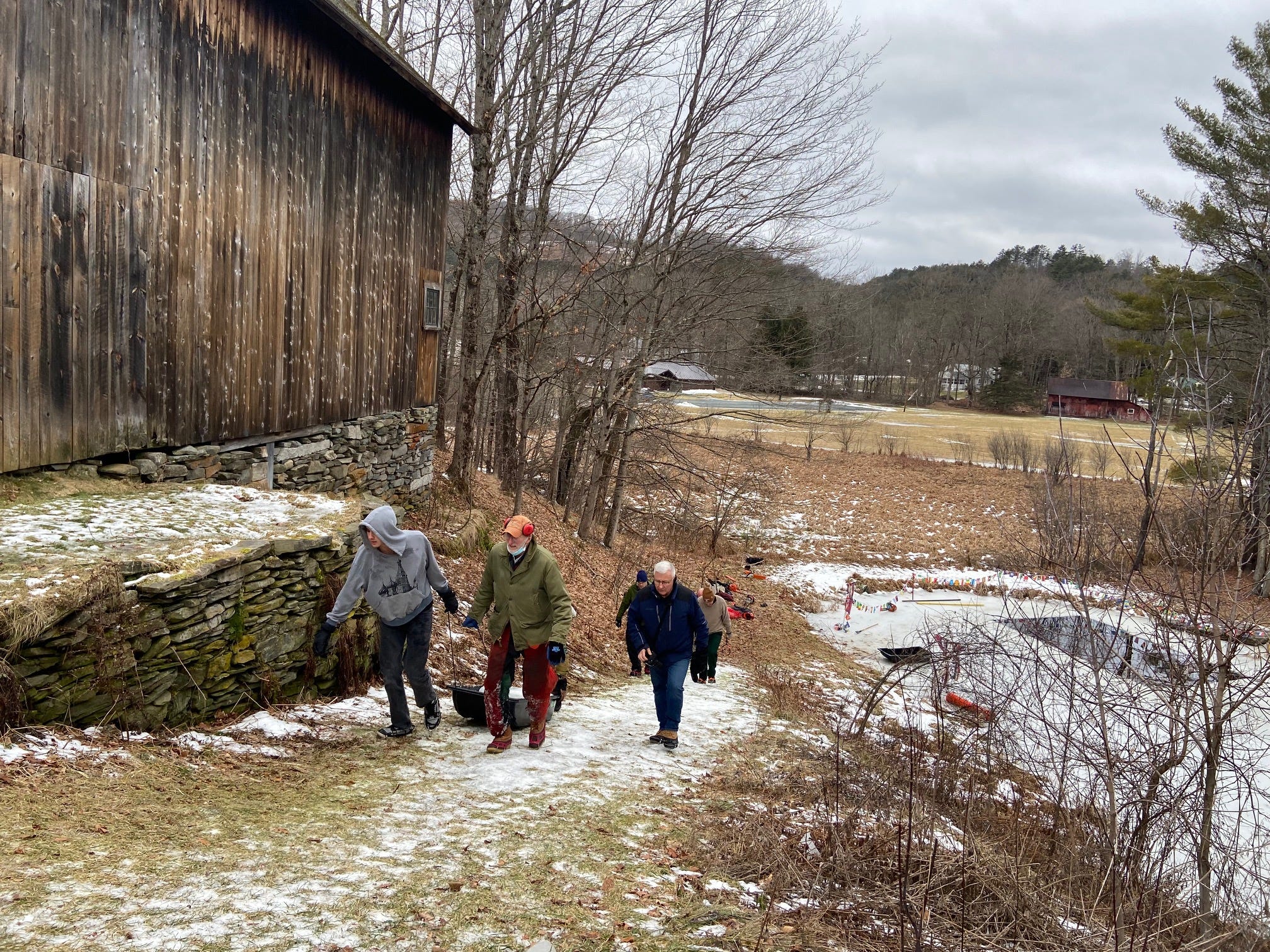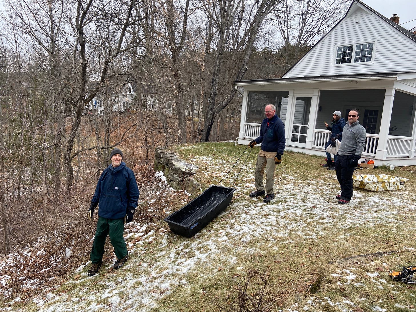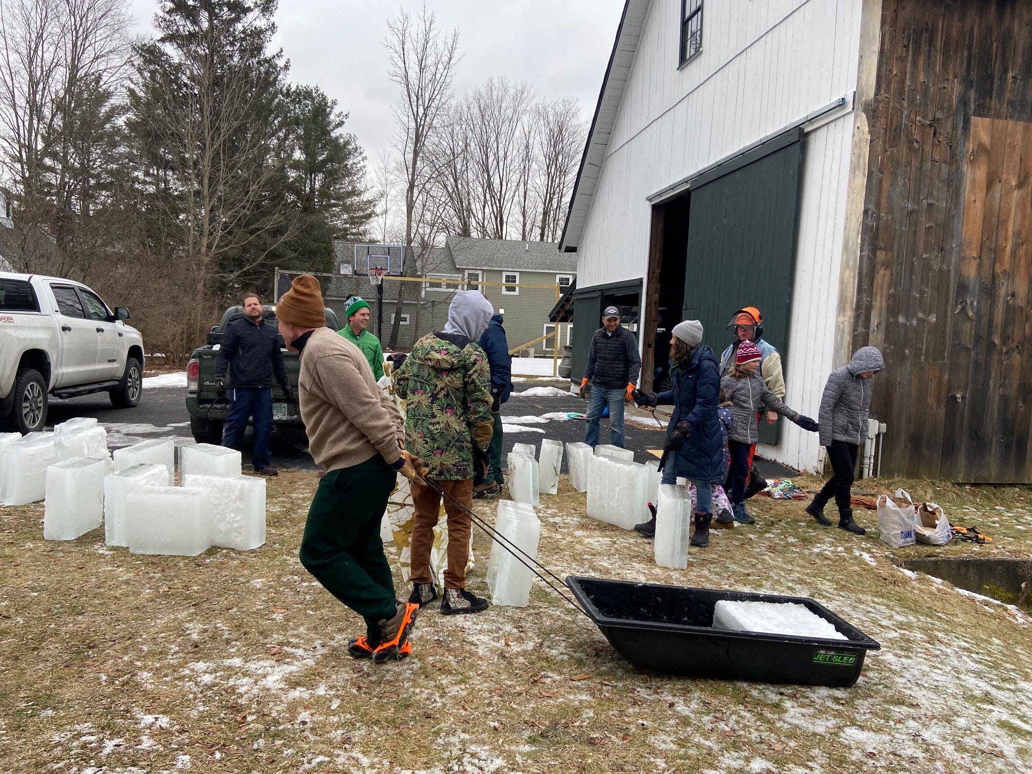 After some discussions on logistics, and some unseasonably warm weather, we came to realize that the best and most efficient way to harvest ice for the slides was from my pond! So Bill recruited his friend Hugh (Bill to let us know his last name) who is just an expert at cutting ice, we all recruited some strong and able bodies to capture the ice once it was released from the saw and then haul it up the hill, into trucks and off to the various schools. Participants were elementary school principals (West Lebanon’s Katie Roach), MCS’s own Greg Bagnato, and many parents and grandparents from all schools, including two Norwich teens and a few elementary students. All in all 20 grandparents, parents and kids participated from Hanover, Lebanon and Norwich. My role was largely getting the donuts from Muriel’s for refueling.