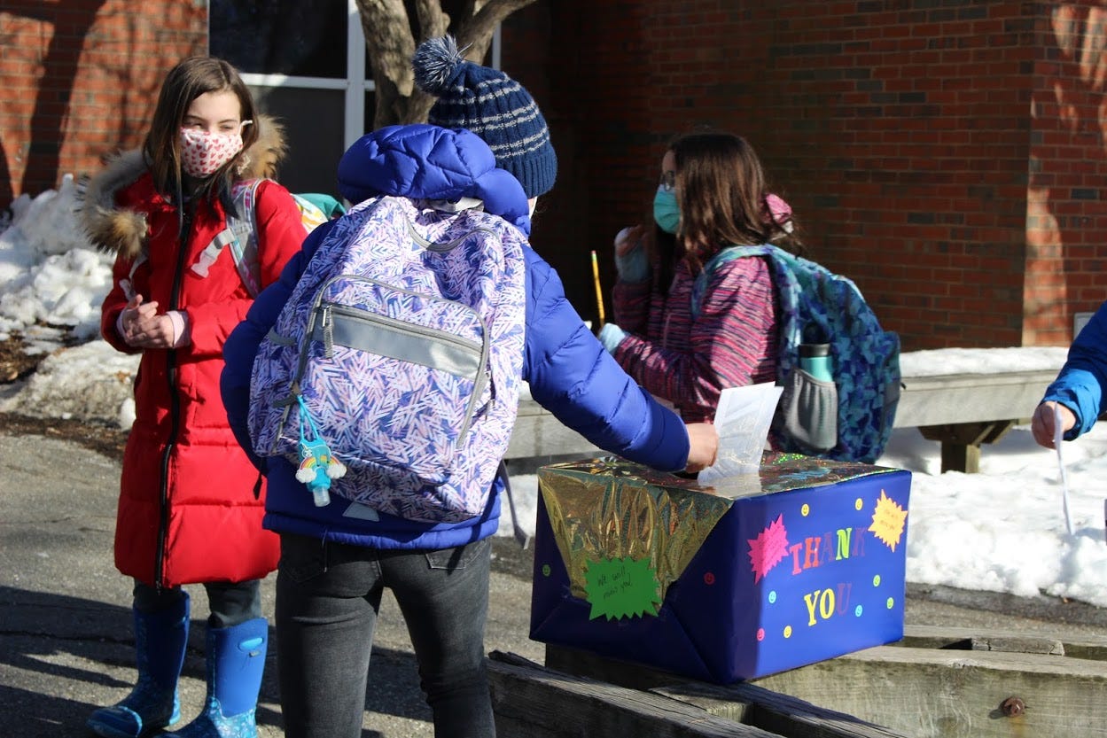 The schoolchildren exercise patience to drop their cards in the beautifully decorated box.