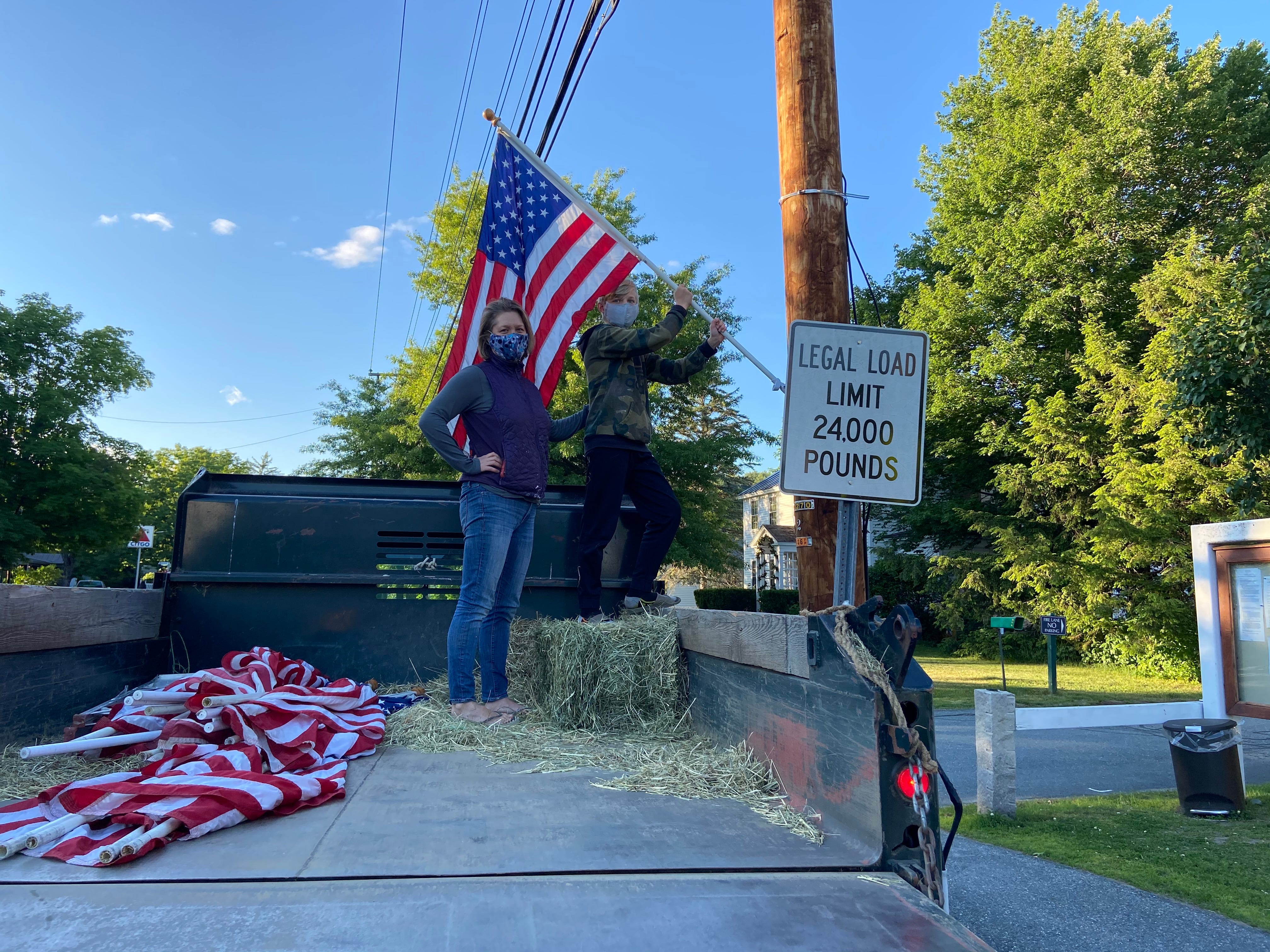 Last night, I assisted Emily Meyers and her son Jack as they put up the flags on Main street to commemorate Flag day. I drove and Emily was showing Jack how to post them properly on the flagpoles. Please don’t tell Jay Van Arman that I drove his truck, as he might have a conniption of rage or hysterics.
