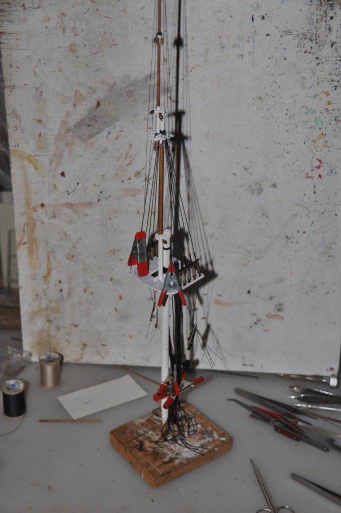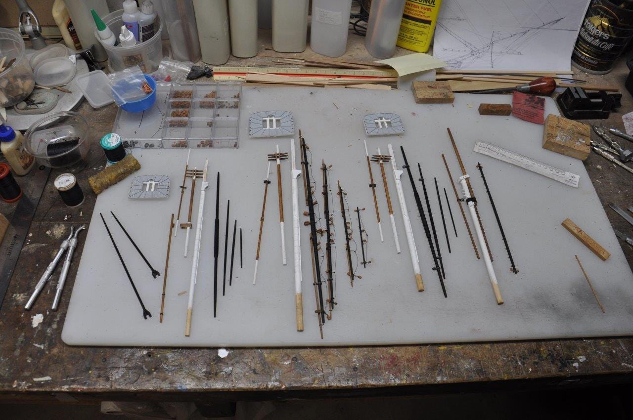 An intermediate step is mast, bowsprit and spar fabrication. Each lower mast section is a composite of over 40 pieces of wood. The fighting tops tops(gray) each have 30 components. All the masts, spars and tops are rigged with blocks and foot ropes prior to assembly on the hull.