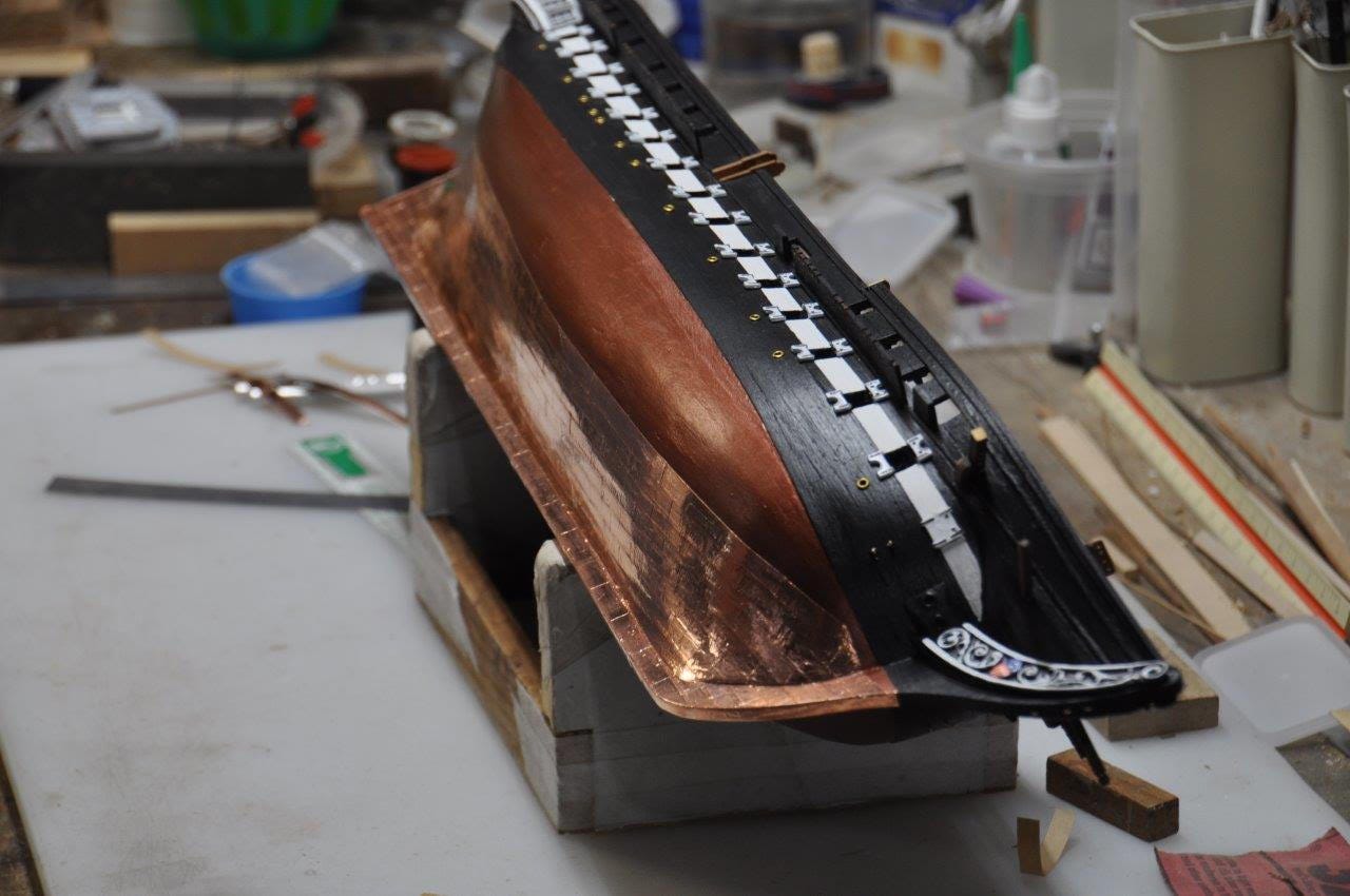 Coppering the hull bottom. This is 1/4(6mm) copper foil cut and dimpled into individual strips.