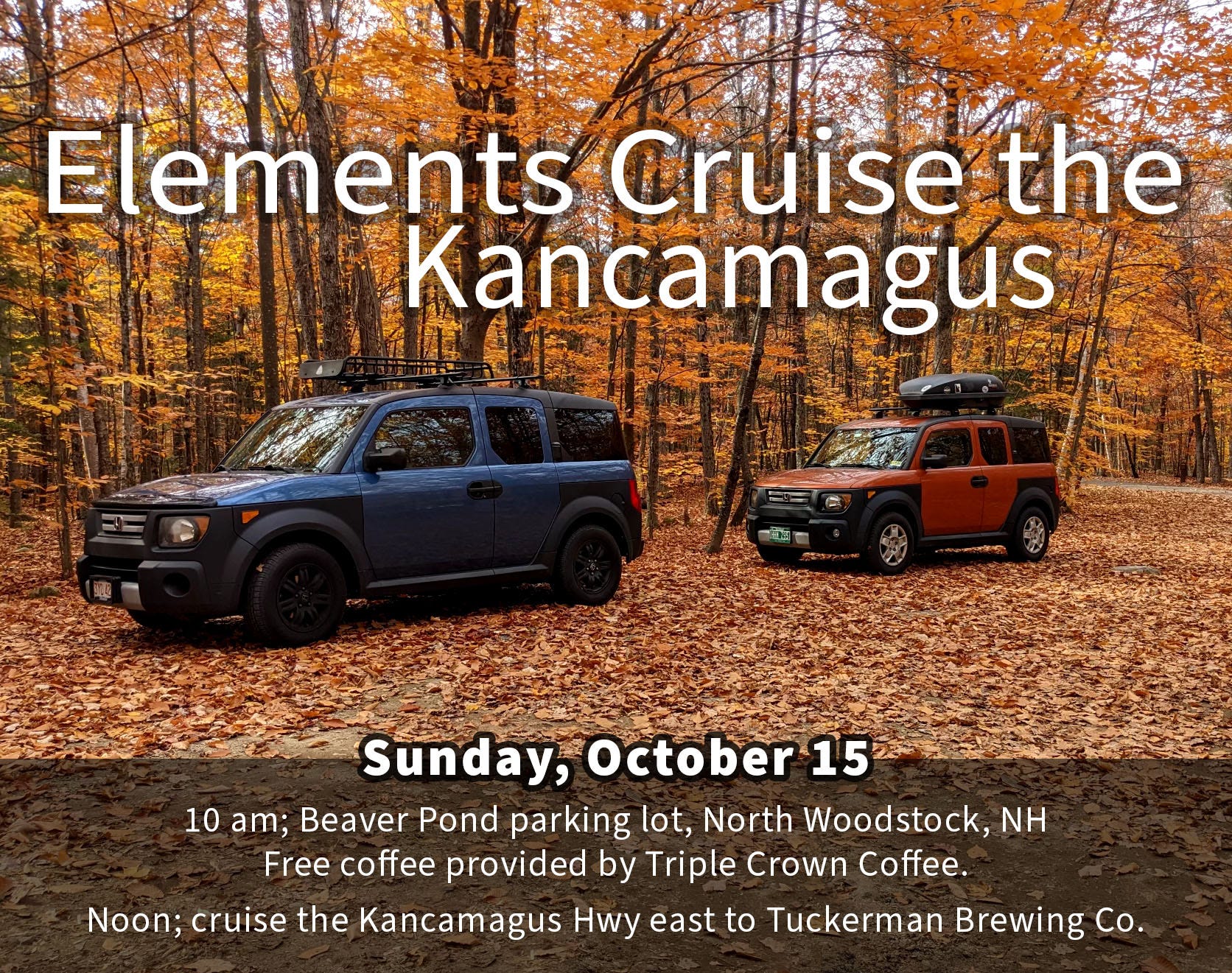 We have some help from a really fantastic Element company-ElementDriven Here is the link to their site.https://elementdriven.com/pages/elements-cruise-the-kanc-event and we’re really excited about bringing together the New England Element community! We just want to get Element owners together to connect, check out each other’s rigs, have some fun together, and enjoy the great company!
