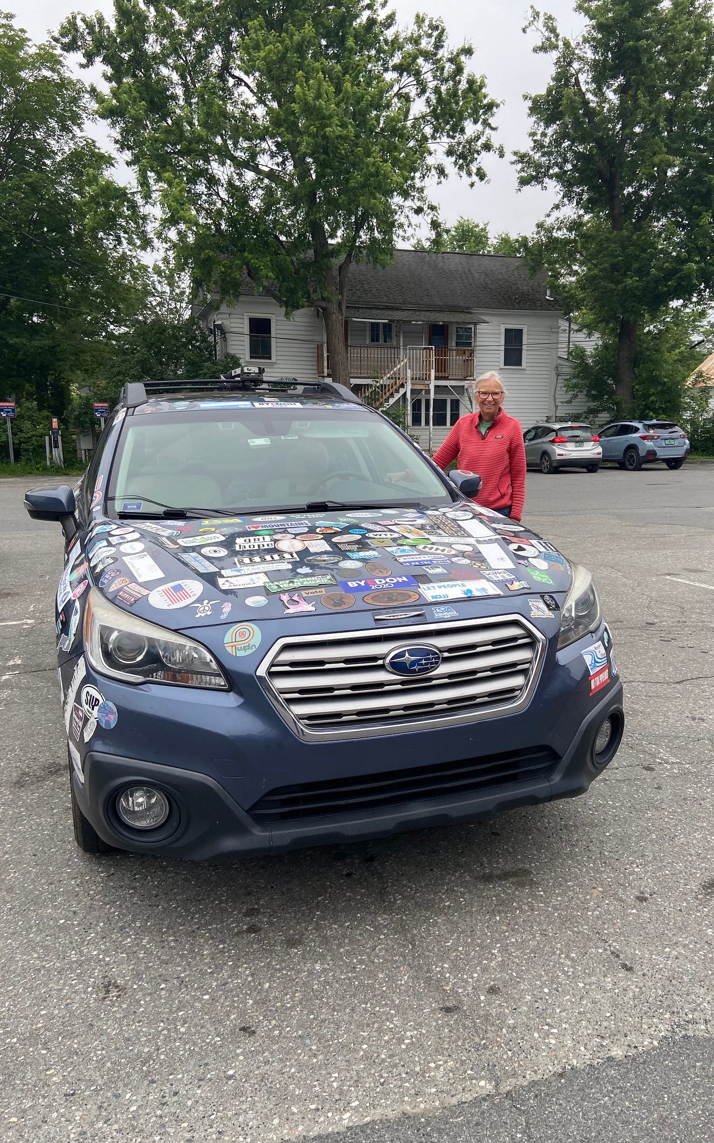 In one of my many visits to Dan and Whit’s to purchase something that I definitely needed, I saw this Subaru Outback pulling in to the parking lot. I stopped and talked with the owner Patty Schultz for a few moments and asked if she would be willing to share the story of how and why she has so many stickers on her vehicle. I also wondered what happens when she runs it through the car wash. Anyway as you can see it holds up pretty well. I asked for her version of how this happened and here is what she had to say: