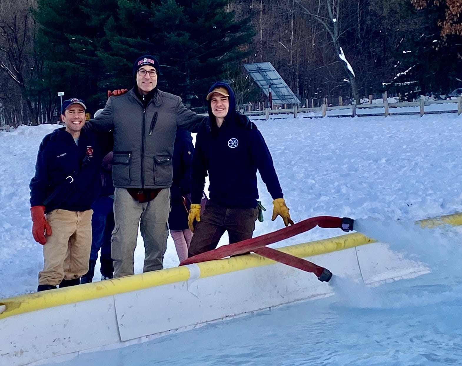 This years heroes include Deputy Chief Matt Swett, and Firefighters Matt Rojansky and Alex Hoehn who filled the rink with 25,000 gallons of water. Firefighter Peter Orner (not in this photo) performs maintenance in below photo.