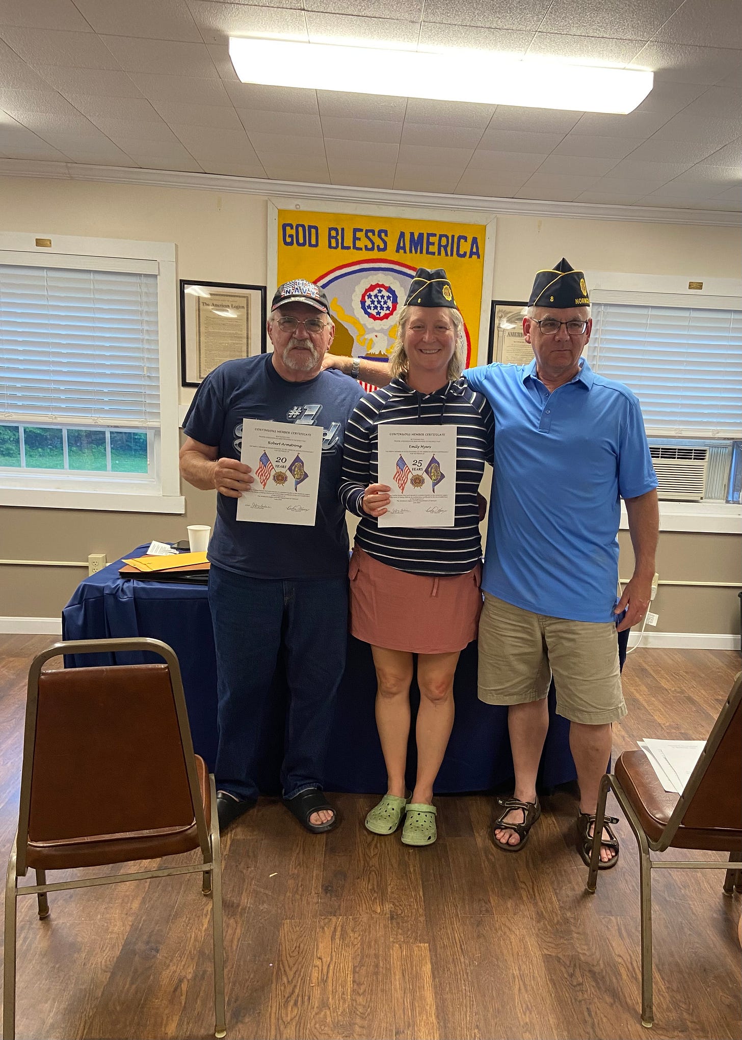 This photo essay is of American Legion members who recently received certificates in honor of their years of service. I also have included a couple of photos of our commander who pitched in to help put the flags out in celebration of our recent July 4 independence day holiday. Yes, you could say that we had to call up the National Guard and our very own Command Sergeant Major Jeff Goodrich answered the call to assist duty roster. That is what service is all about.