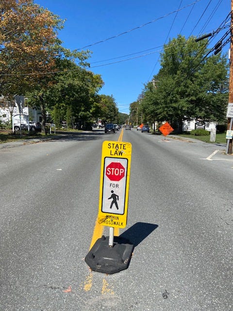 This sign will remind you that you must stop when someone is crossing in a crosswalk. The next photo will show the newly painted crosswalk in front of the Town Hall.
