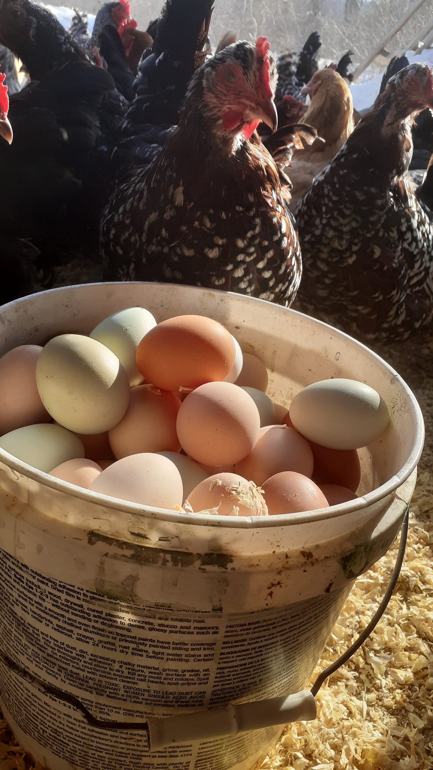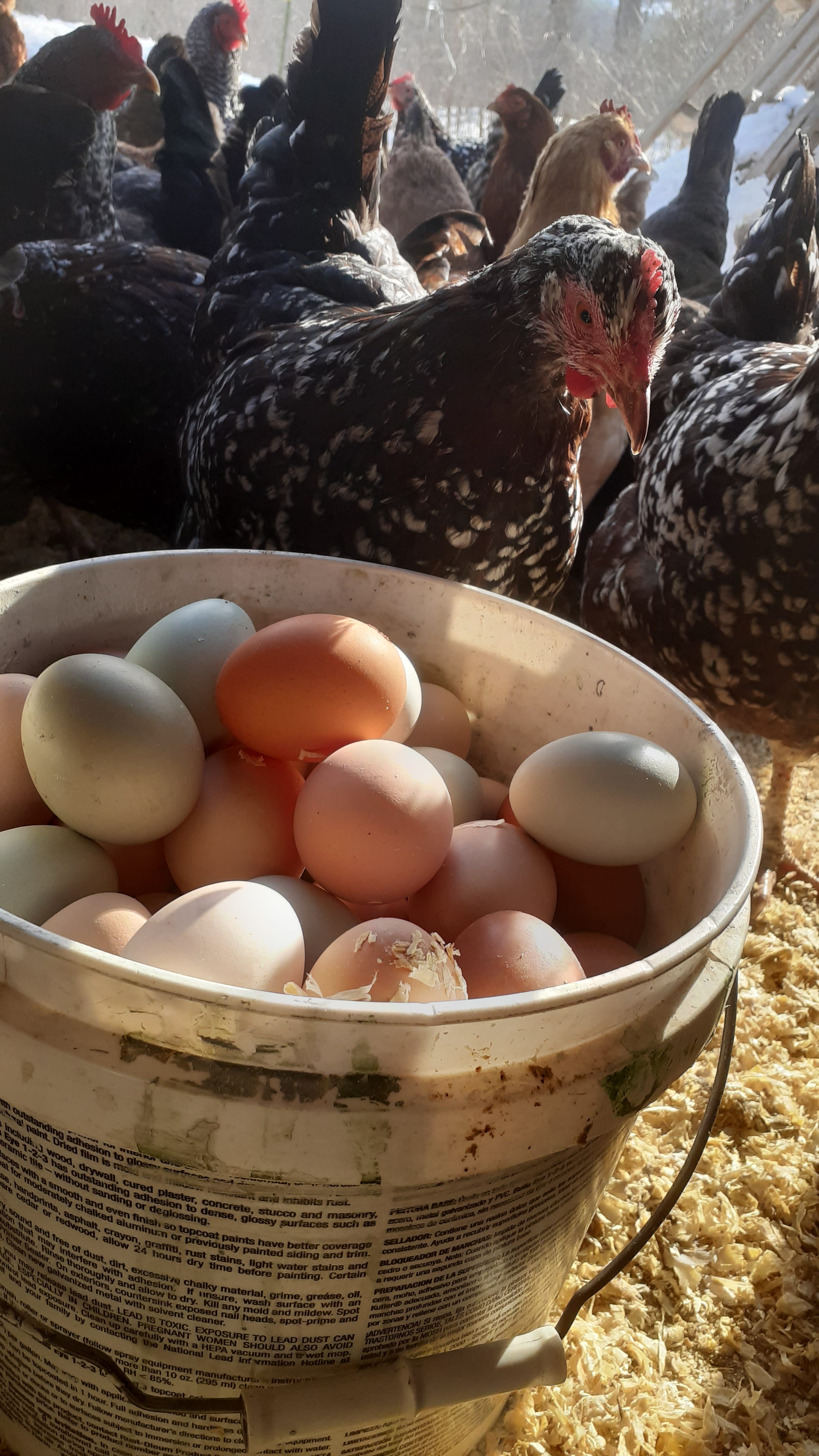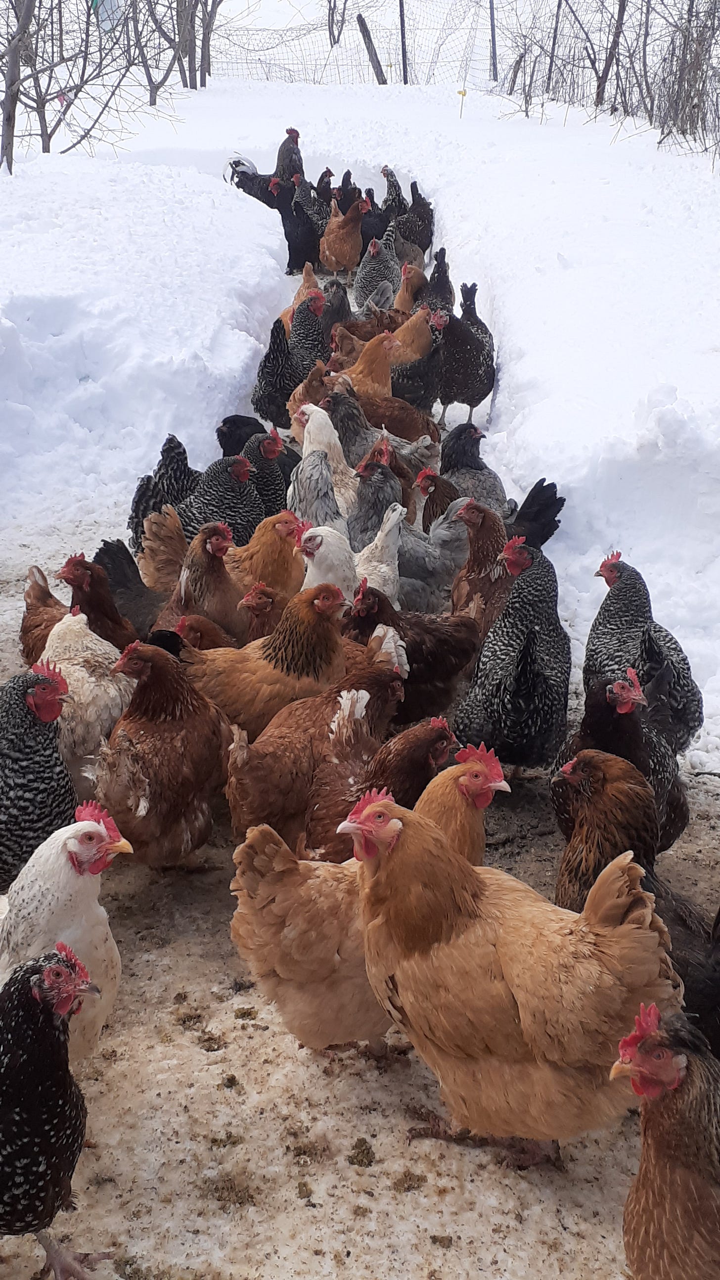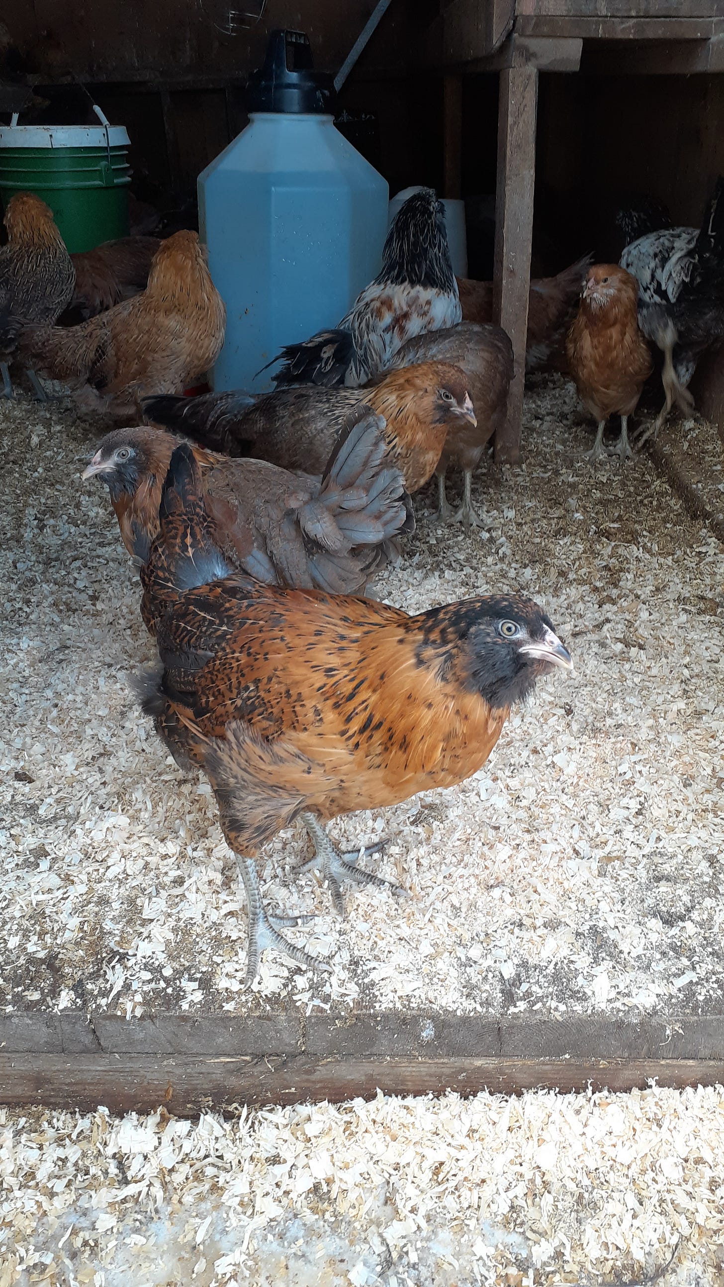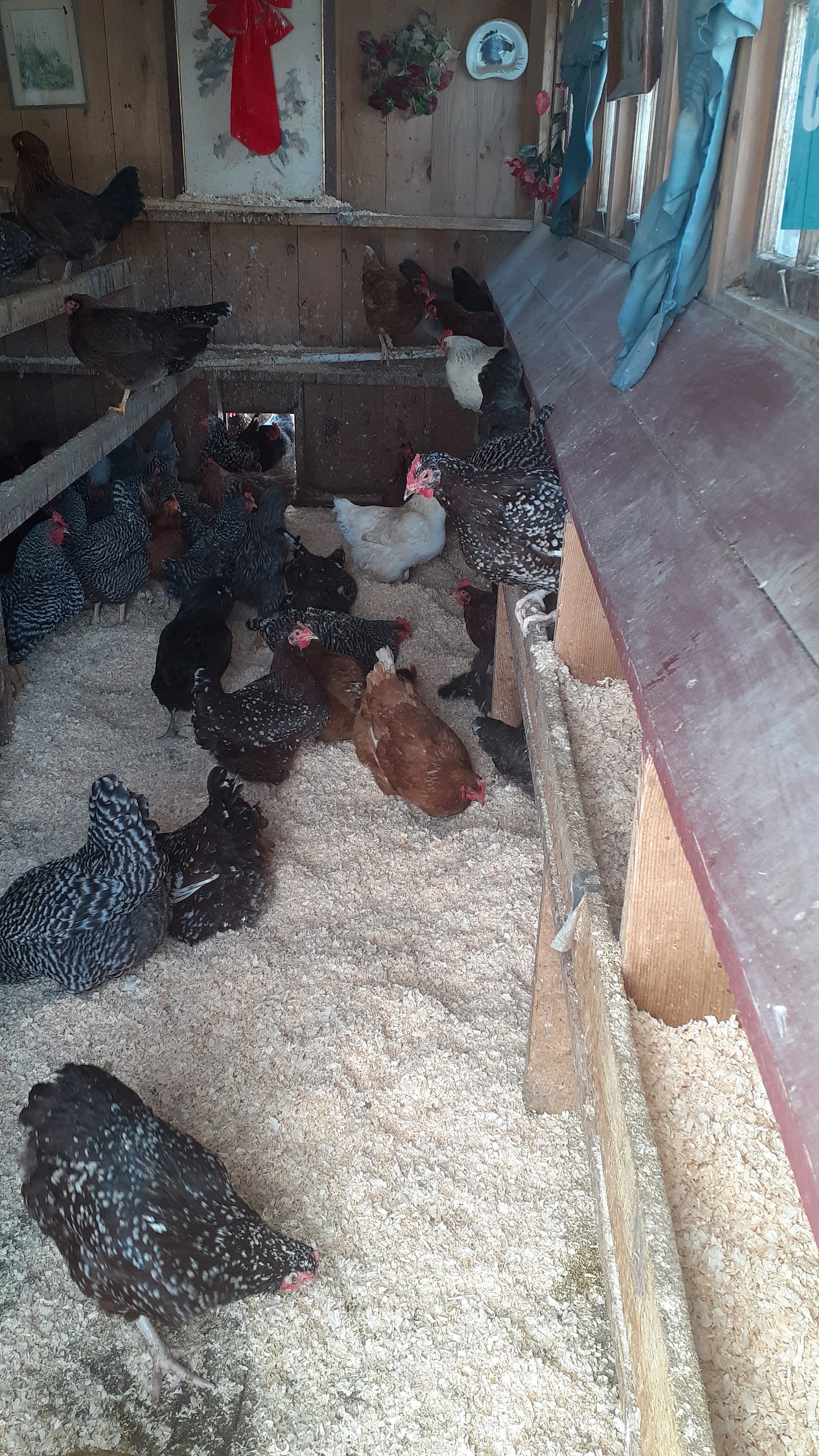 Coop Cleaning day and the chickens or “Girls’ as Jessica calls them are not happy that they had be locked out for 20 minutes while she cleaned the coop. A couple of them protested and laid their eggs outside. They were however all happy to get back inside and to a nice clean home once again.