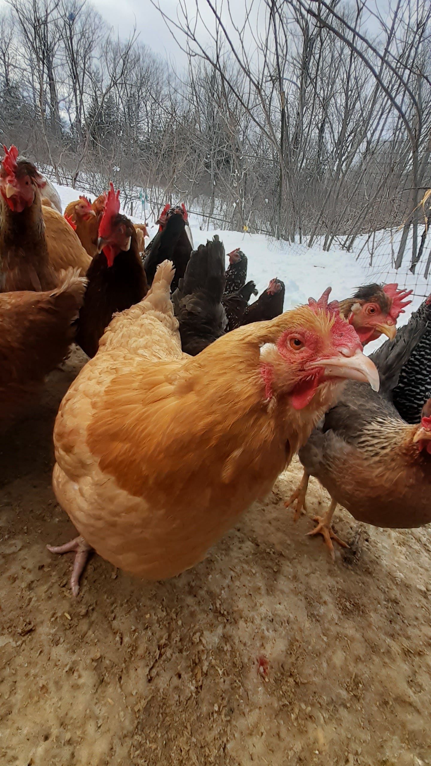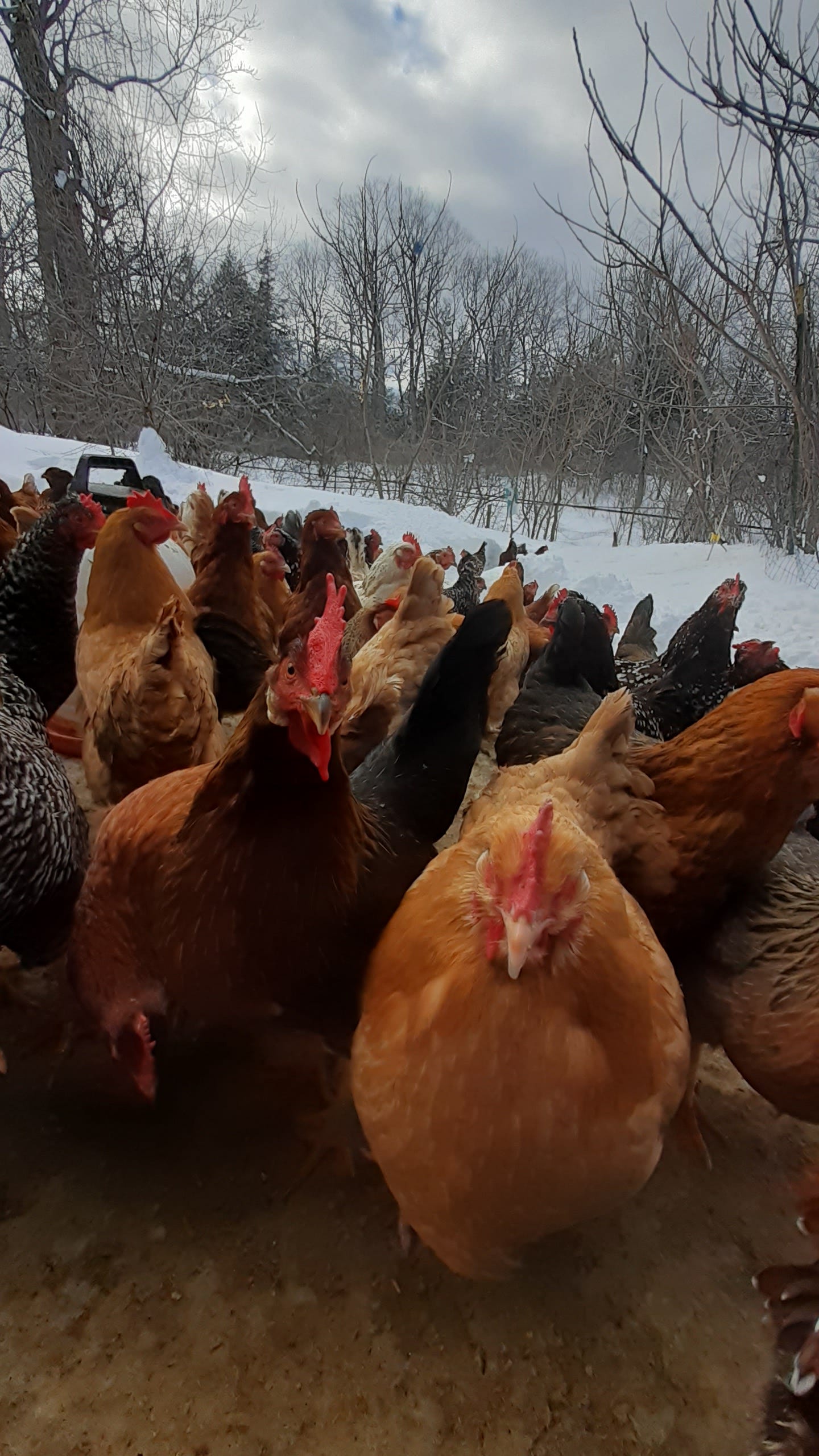 There are some new “girls” on the block according to Jessica who sent these photos and info on her chickens who are about to lay some eggs in time for Easter. She calls them the Easter egg layers. These eggs will be blue or green and they will be coming to a farm stand near you soon. Their Christmas tree is buried but the lights still come on at night.
