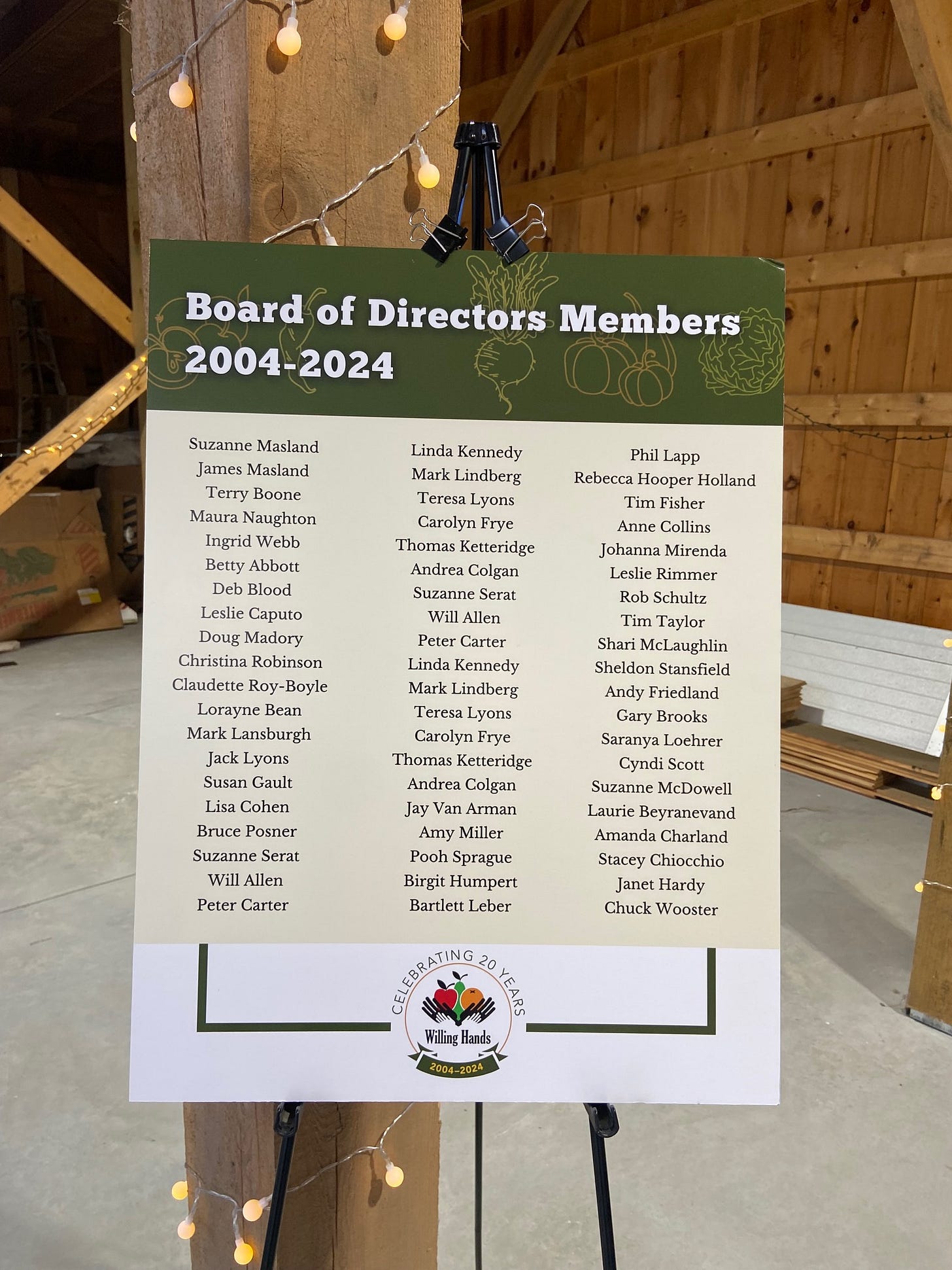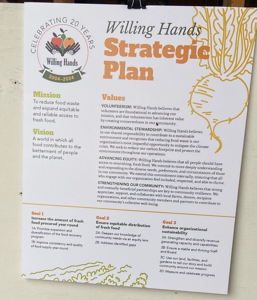 A bit about the program: Gabe Zoerheide, the executive director, and other leaders and volunteers will speak about Willing Hands over the years as well as what the future holds. Some volunteers will be recognized, as well as the COOP, a critical partner in the initiation of the organization 20 years ago now, and still today. The founders will also be recognized, and Willing Hands will announce the initiation of the Sunny Fields Fund, in honor of Jack and Terry Lyons. This Board-designated fund will support the long-term health and viability of Willing Hands, ensuring that their legacy of compassion and service endures for years to come.
